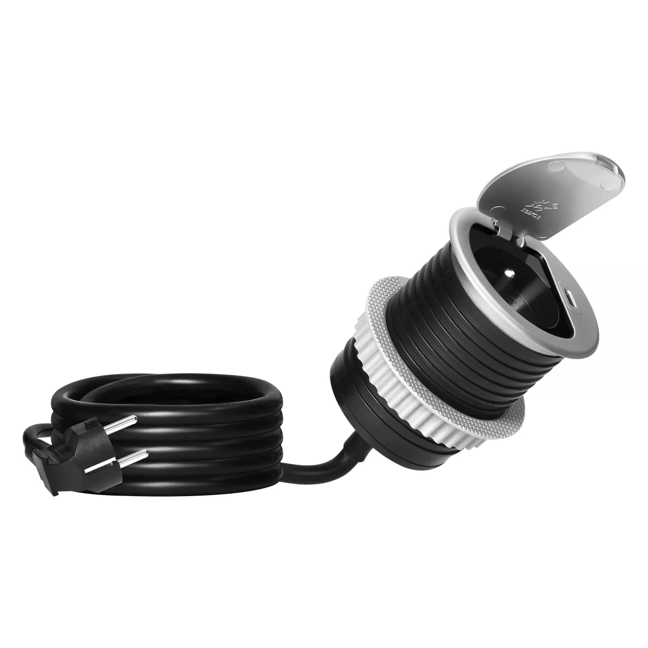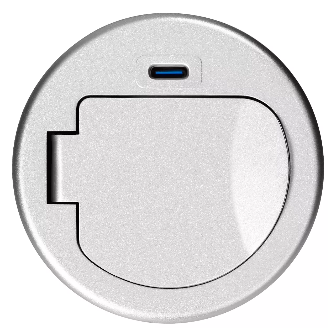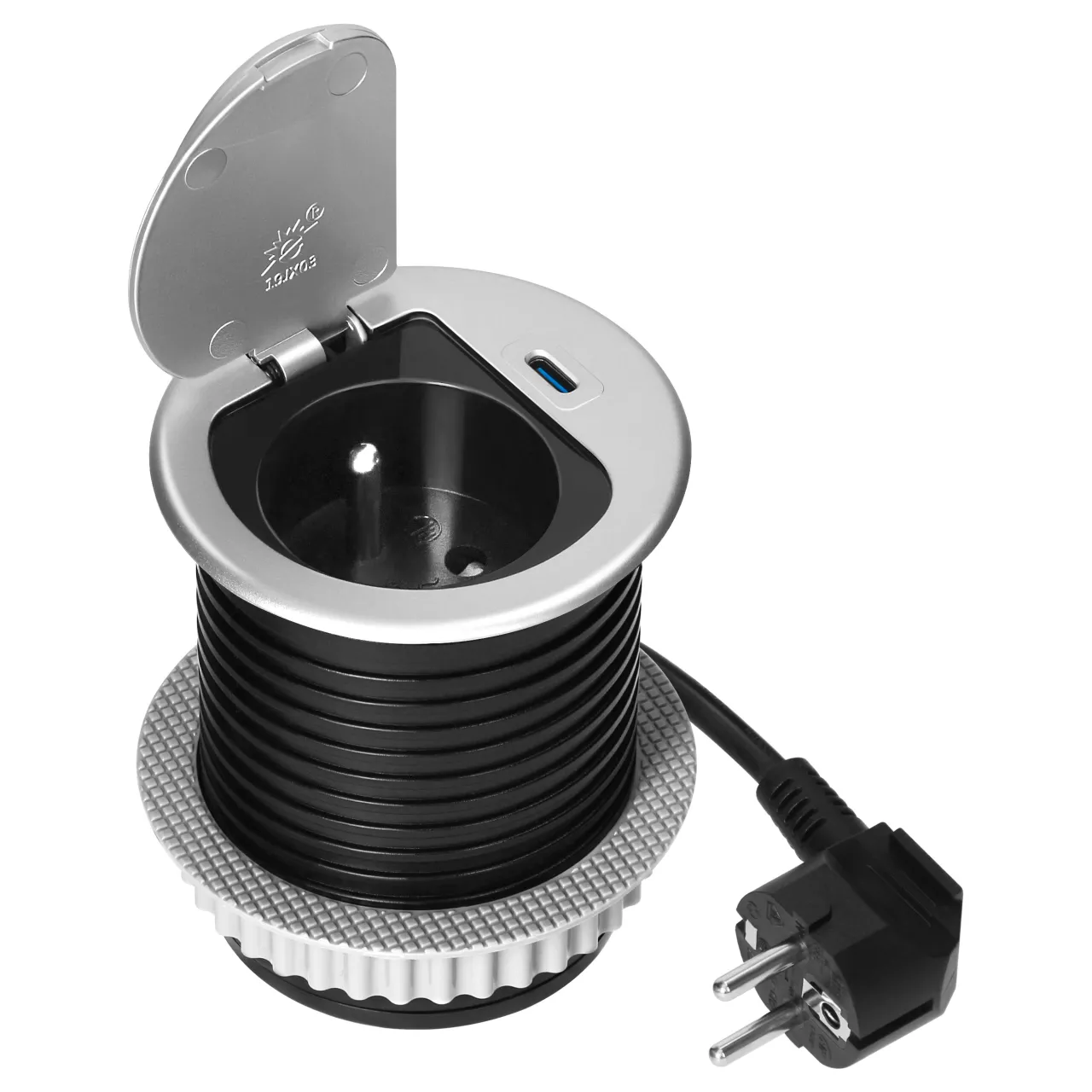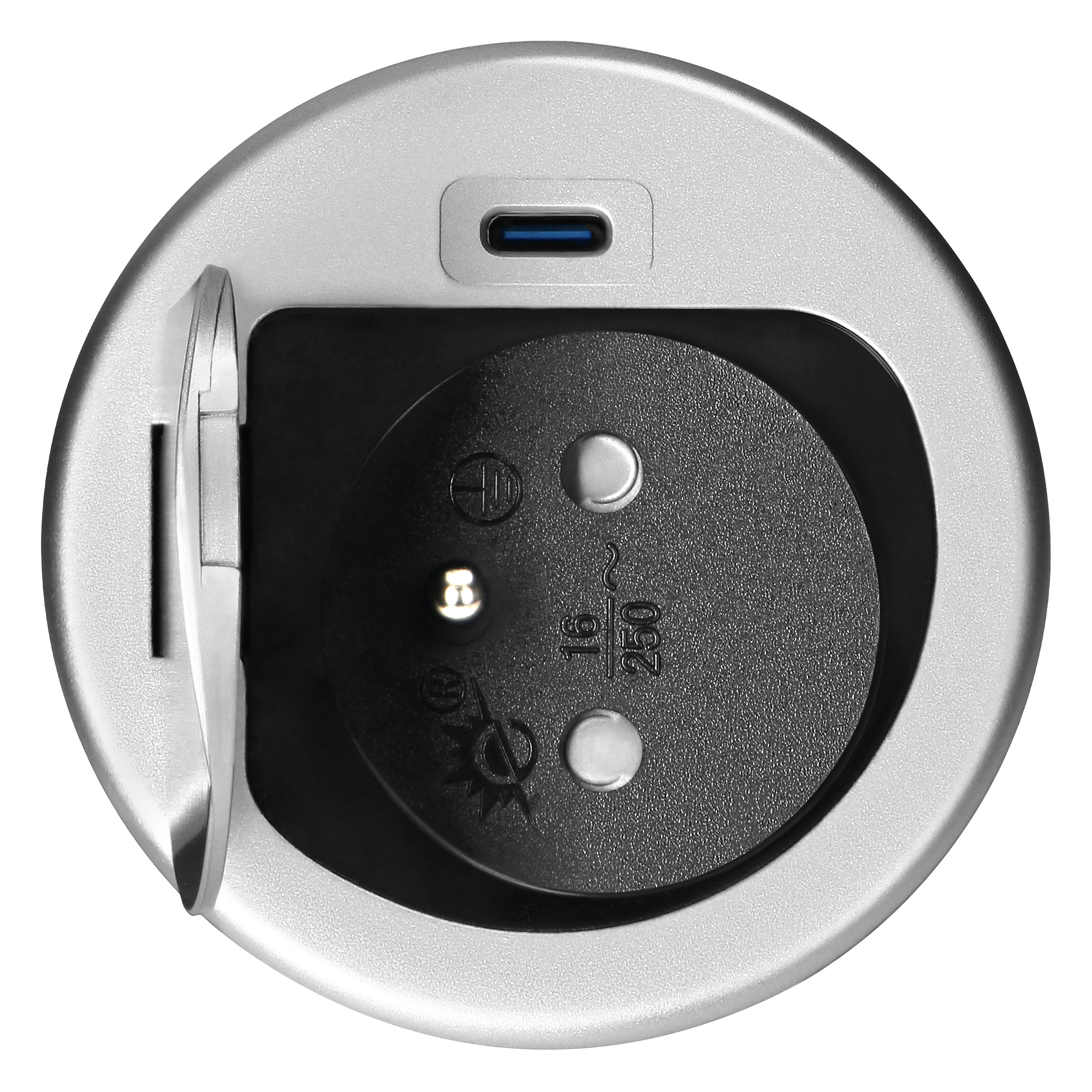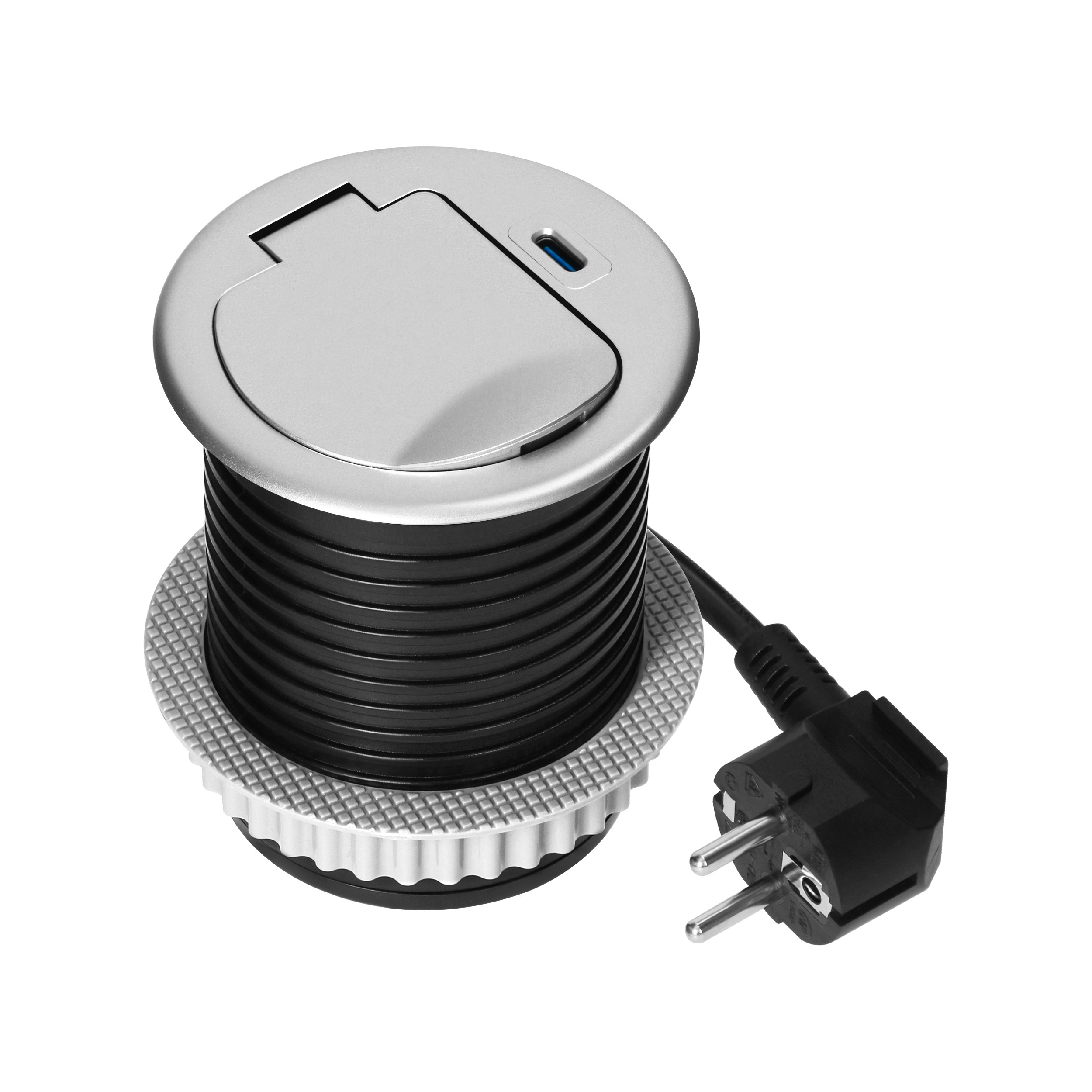 Gniazdo meblowe Ø6cm wpuszczane w blat z pokrywką, ładowarką USB i przewodem 1,9m, 1x2P+Z (French), 1xUSB (typ C; PD20W), srebrne