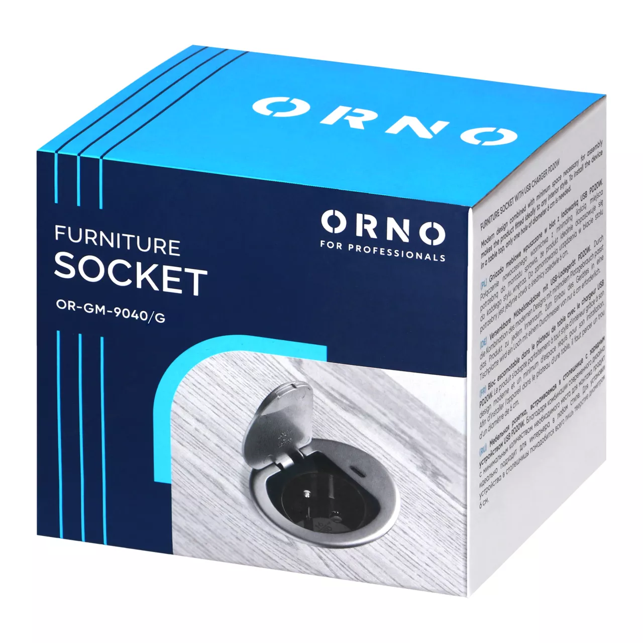 Gniazdo jest w kolorze srebrnym, o okrągłym kształcie (średnica wynosi 6cm). Gniazdo doskonale sprawdzi się wewnątrz pomieszczeń suchych, takich jak biuro, gabinet, sala konferencyjna czy salon.