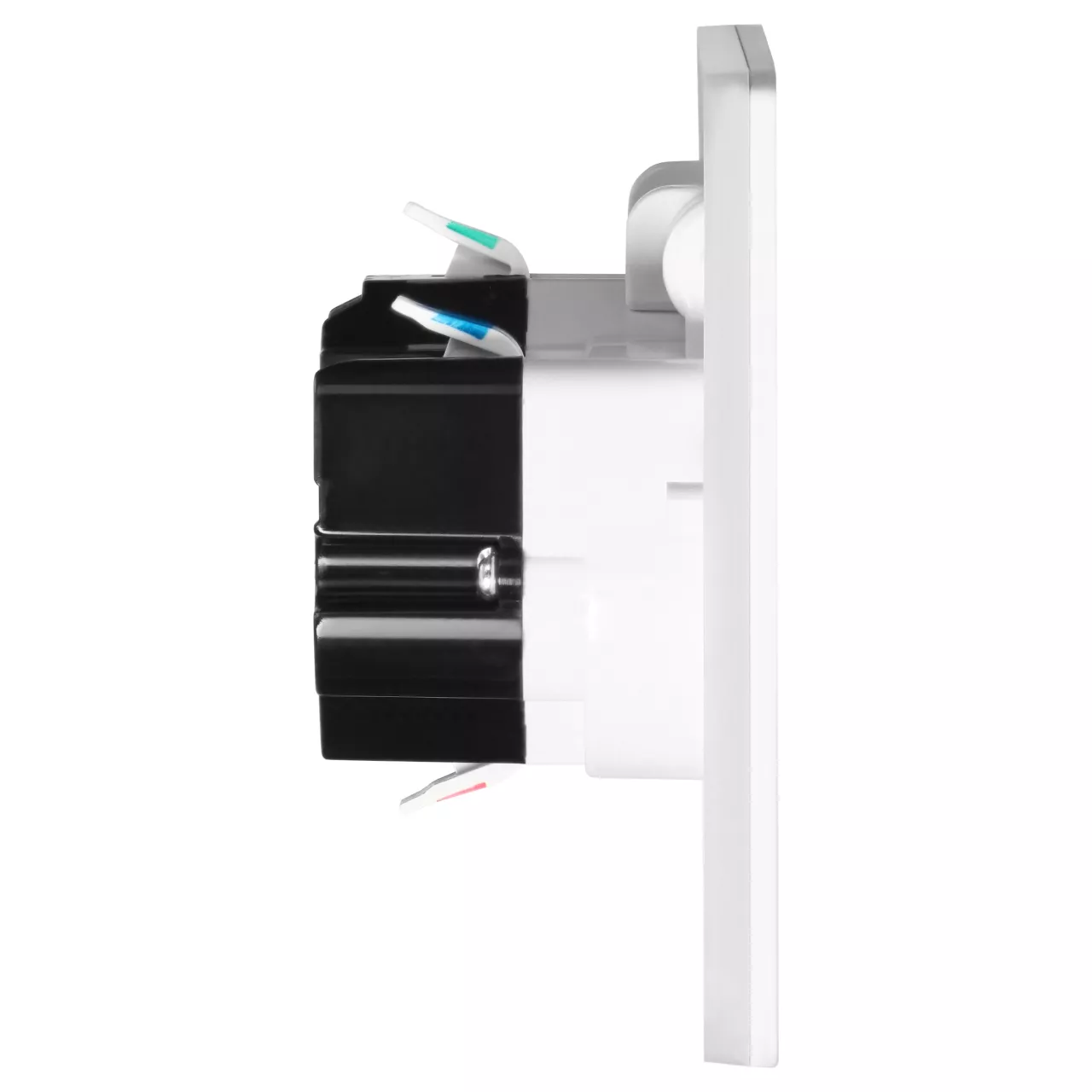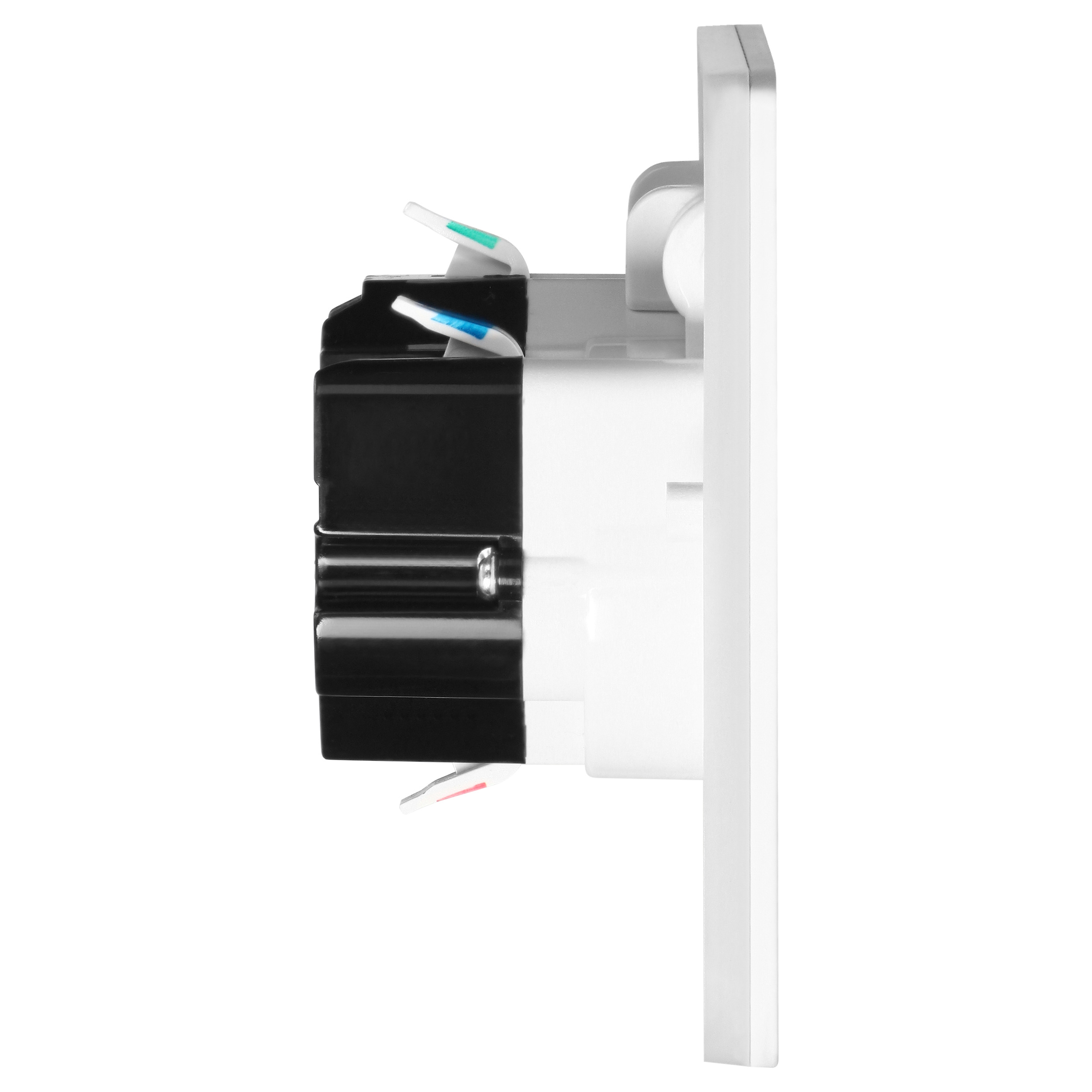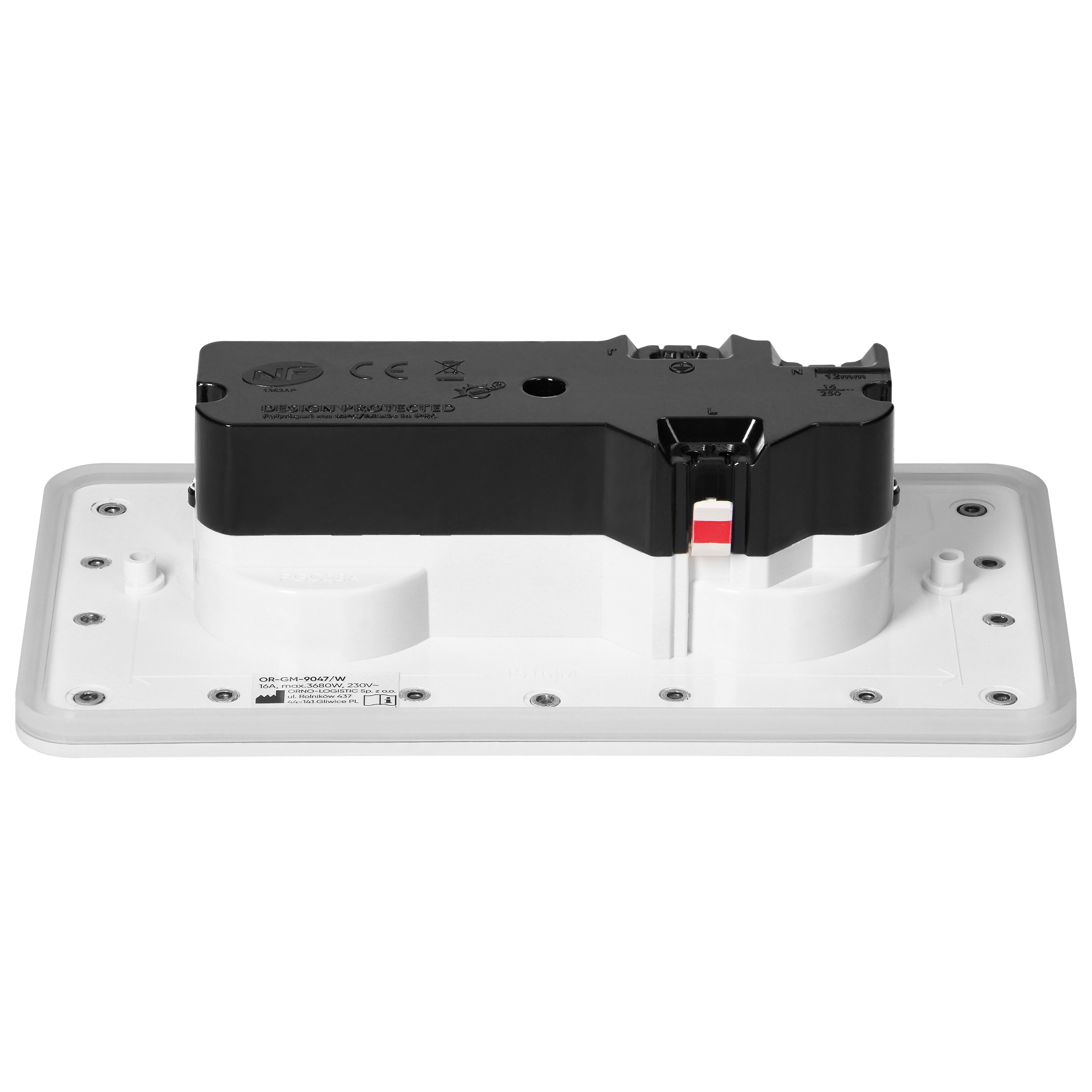 Gniazdo posiada prostokątną konstrukcję o wymiarach 166x90x42,4 mm, z grubością rantu wynoszącą 6 mm, który ułatwia jego montaż z powierzchnią, w której jest osadzony.