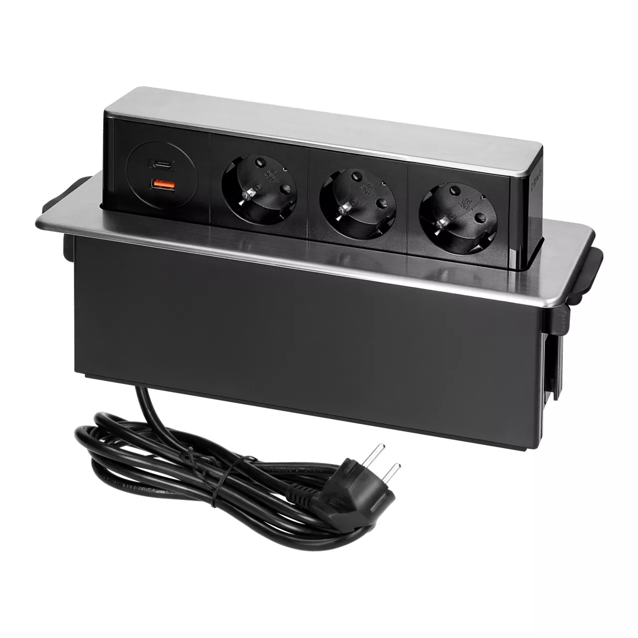 Gniazdo meblowe wysuwane z blatu z płaskim frezowanym rantem, ładowarką USB i przewodem 2m, 3x2P+Z (Schuko), 2 x USB (Typ A+C ; PD20W), 3x1,5mm², INOX