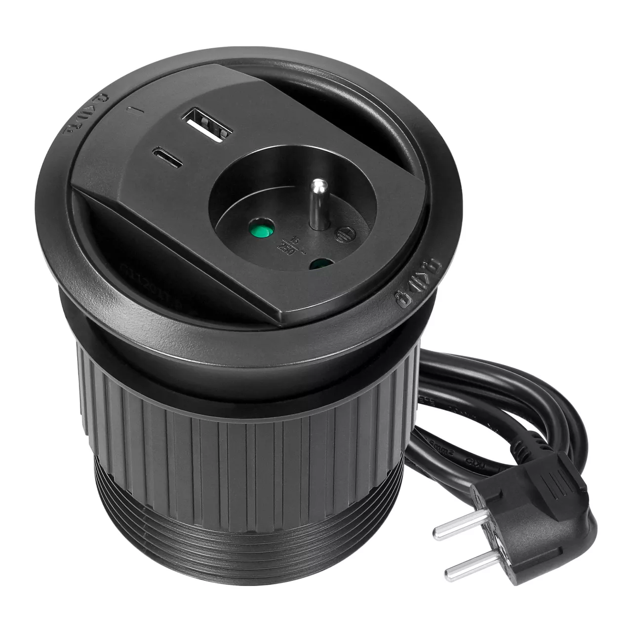Gniazdo wpuszczane w blat z ładowarką USB, przepustem kablowym, i przewodem 1,4 m, 1x2P+Z (French), 2xUSB (typ A+C; PD20W), czarne