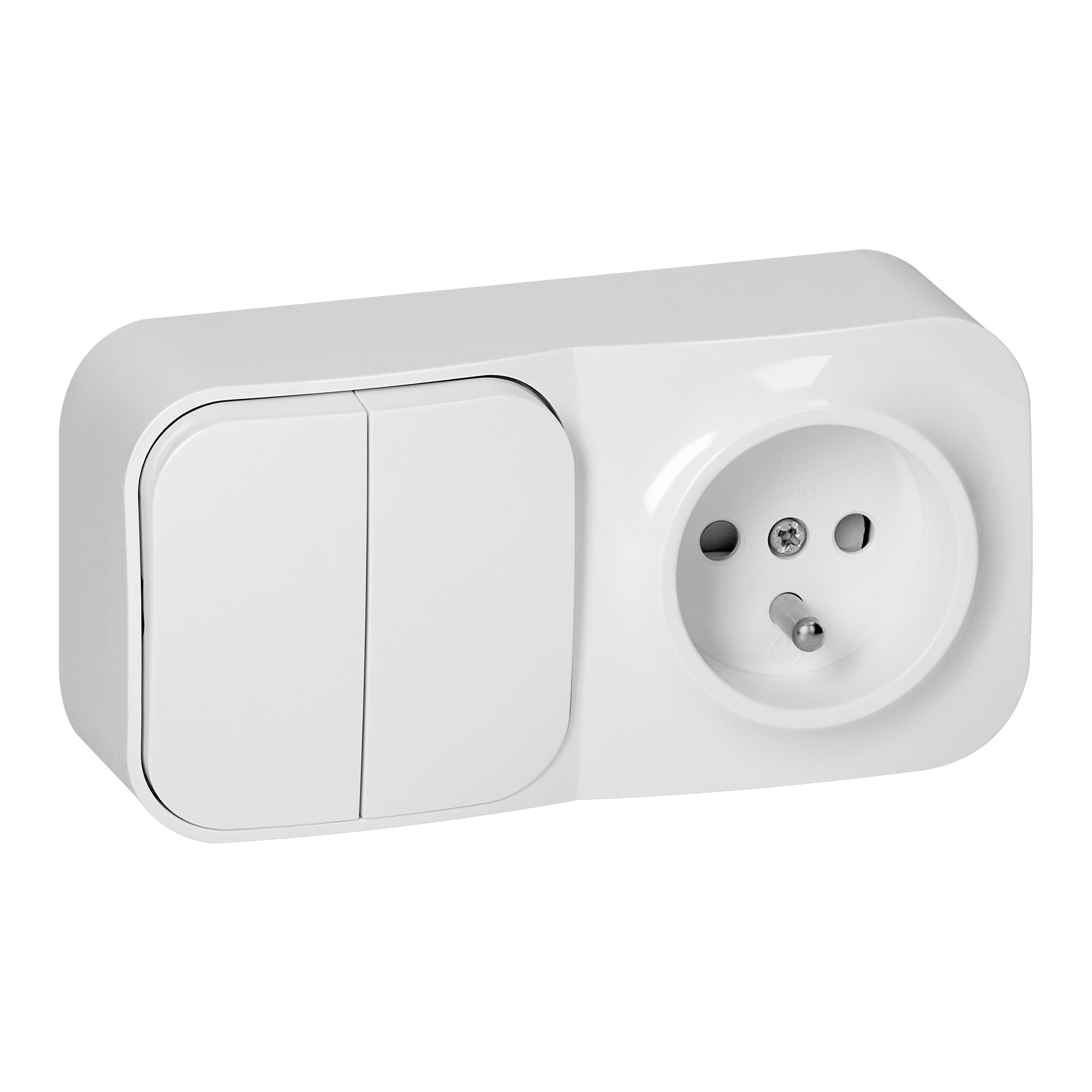 Podwójny osprzęt, w którego skład wchodzą zintegrowany łącznik świecznikowy oraz gniazdo w standardzie francuskim (2P+Z). Jest to wygodne rozwiązanie dla niewielkich powierzchni. Do użytku w pomieszczeniach (IP20). Produkt przeznaczony jest do pracy w instalacjach jednofazowych, przy napięciu znamionowym 250V, 50Hz i prądzie 16A.