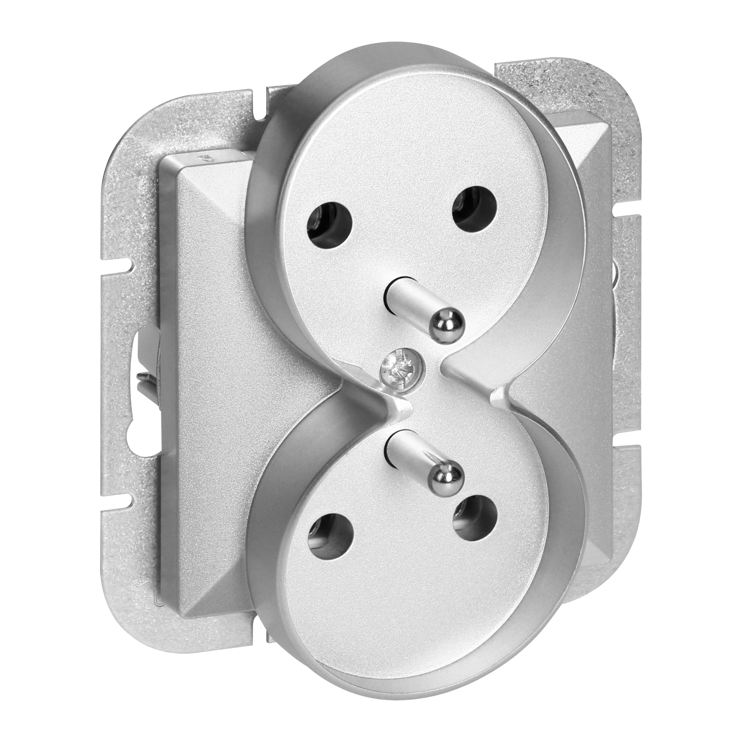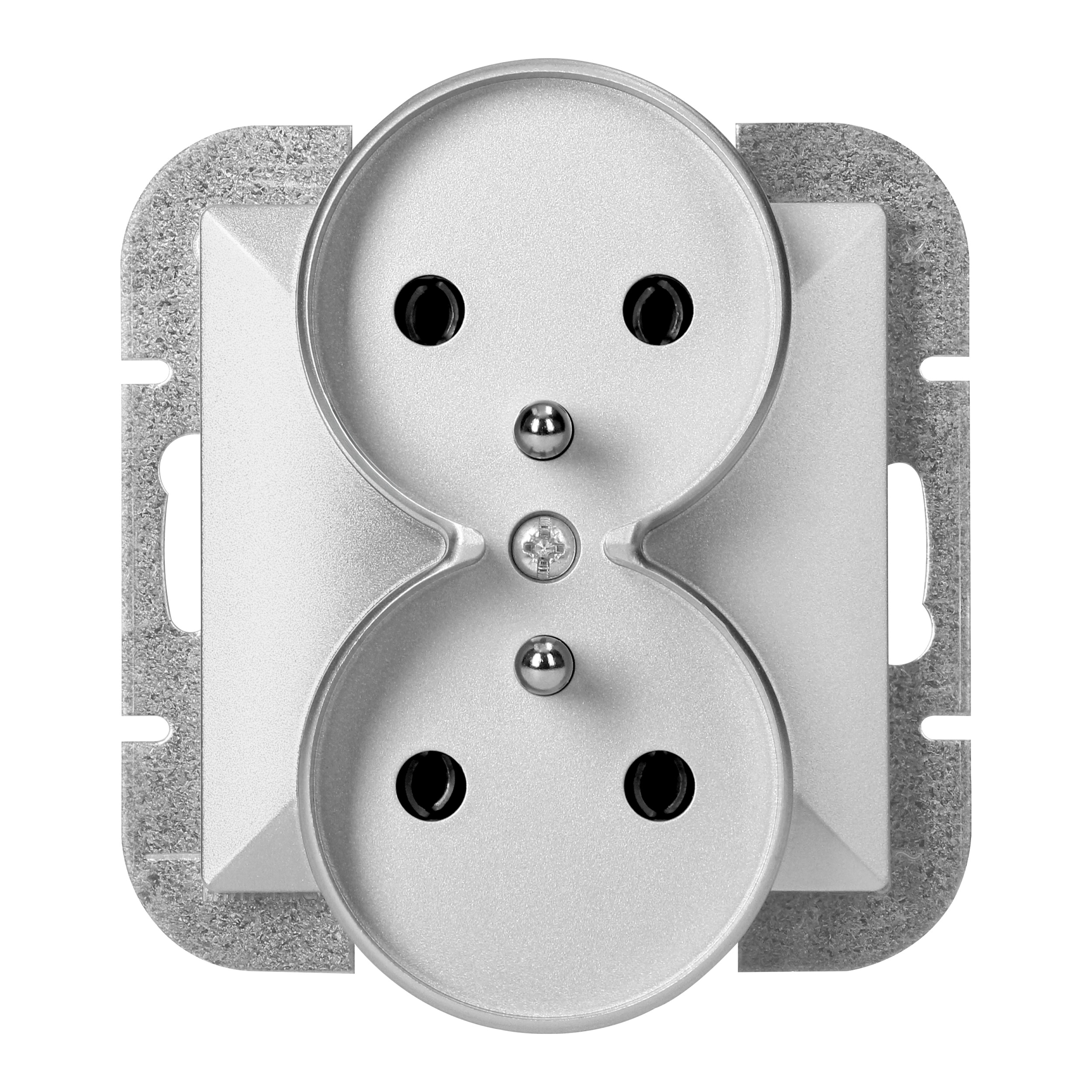 Podwójne gniazdo typu francuskiego do systemu ramkowego, podtynkowe 2x2P+Z. Należy stosować wewnątrz pomieszczeń (IP20).