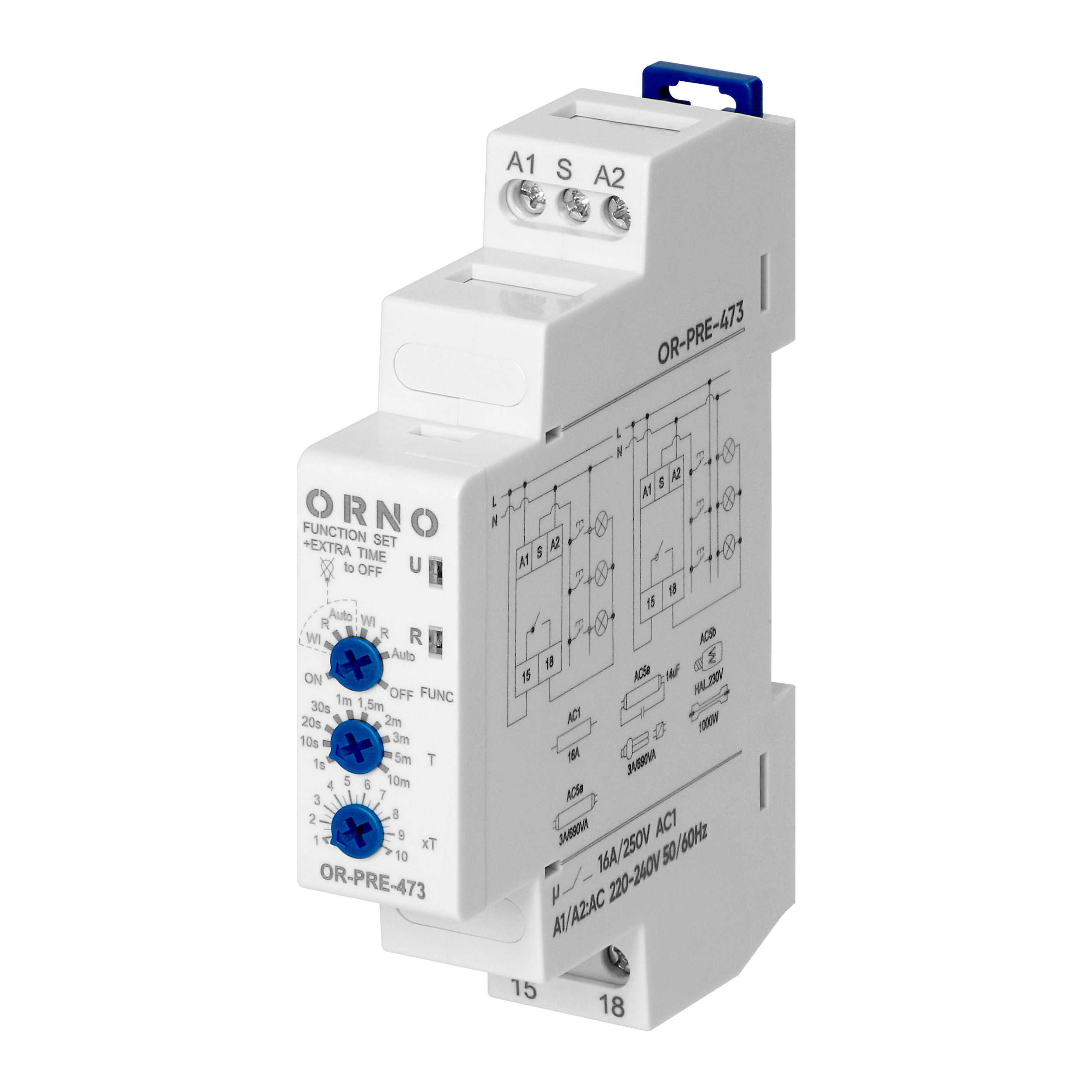 - tryby AUTO, R oraz Wi mogą pracować z dodatkowym trybem EXTRA TIME, w którym po odmierzeniu czasu z trybu podstawowego, zestyk R zostaje wyłączony na czas 1s, a potem ponownie załączony na czas 10s. Po odmierzeniu czasu 10 s zestyk R zostaje rozłączony.