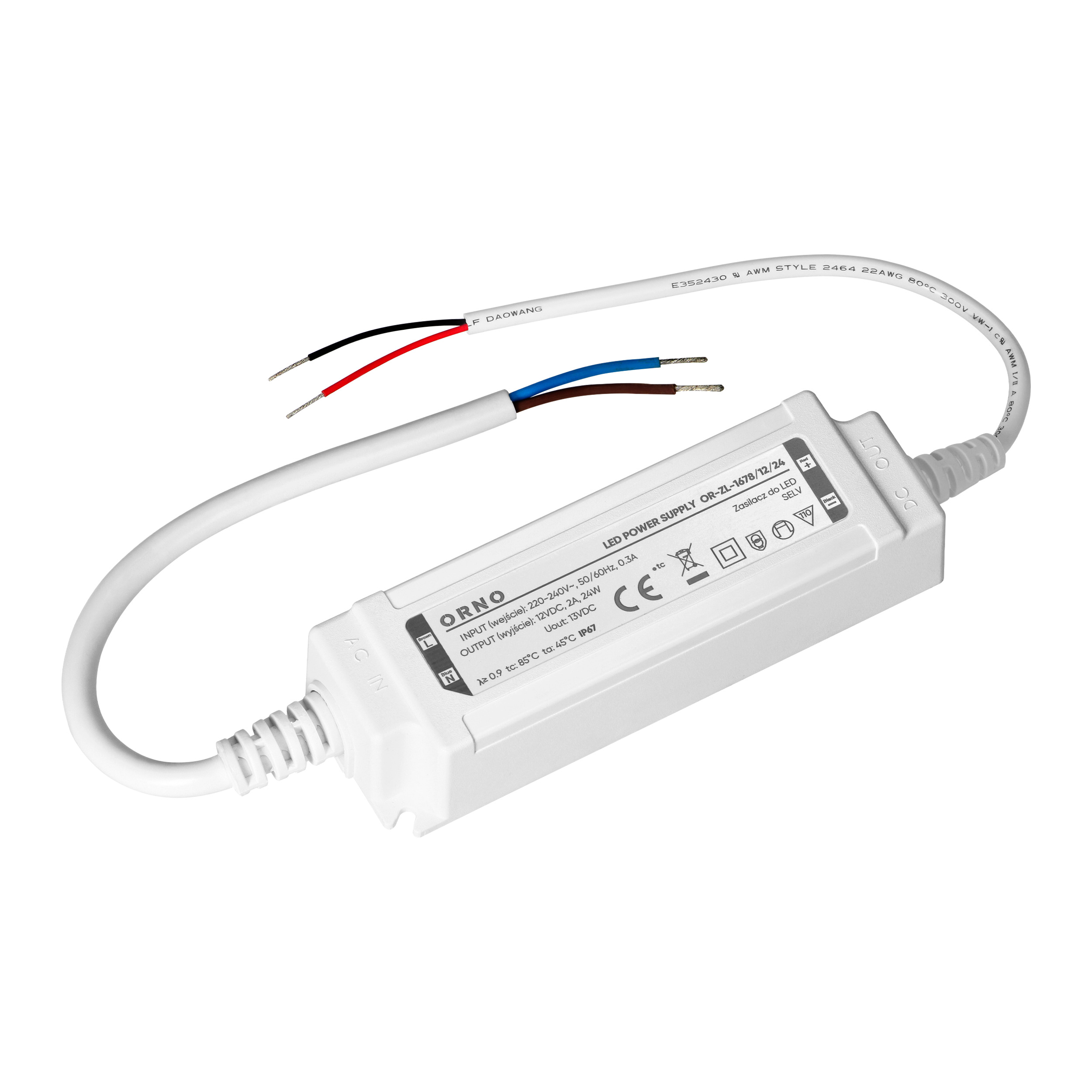 Urządzenie działa w zakresie napięcia wejściowego 220-240V i zapewnia maks. moc wyjściową 24W. Jego hermetyczna, wodoodporna obudowa wykonana z tworzywa sztucznego spełnia wymagania klasy ochrony IP67. Wysoka szczelność obudowy skutecznie chroni zasilacz przed wodą, pyłem i innymi czynnikami zewnętrznymi, co zapewnia długotrwałą i niezawodną pracę nawet w wymagającym otoczeniu, przede wszystkim dla oświetlenia zewnętrznego.