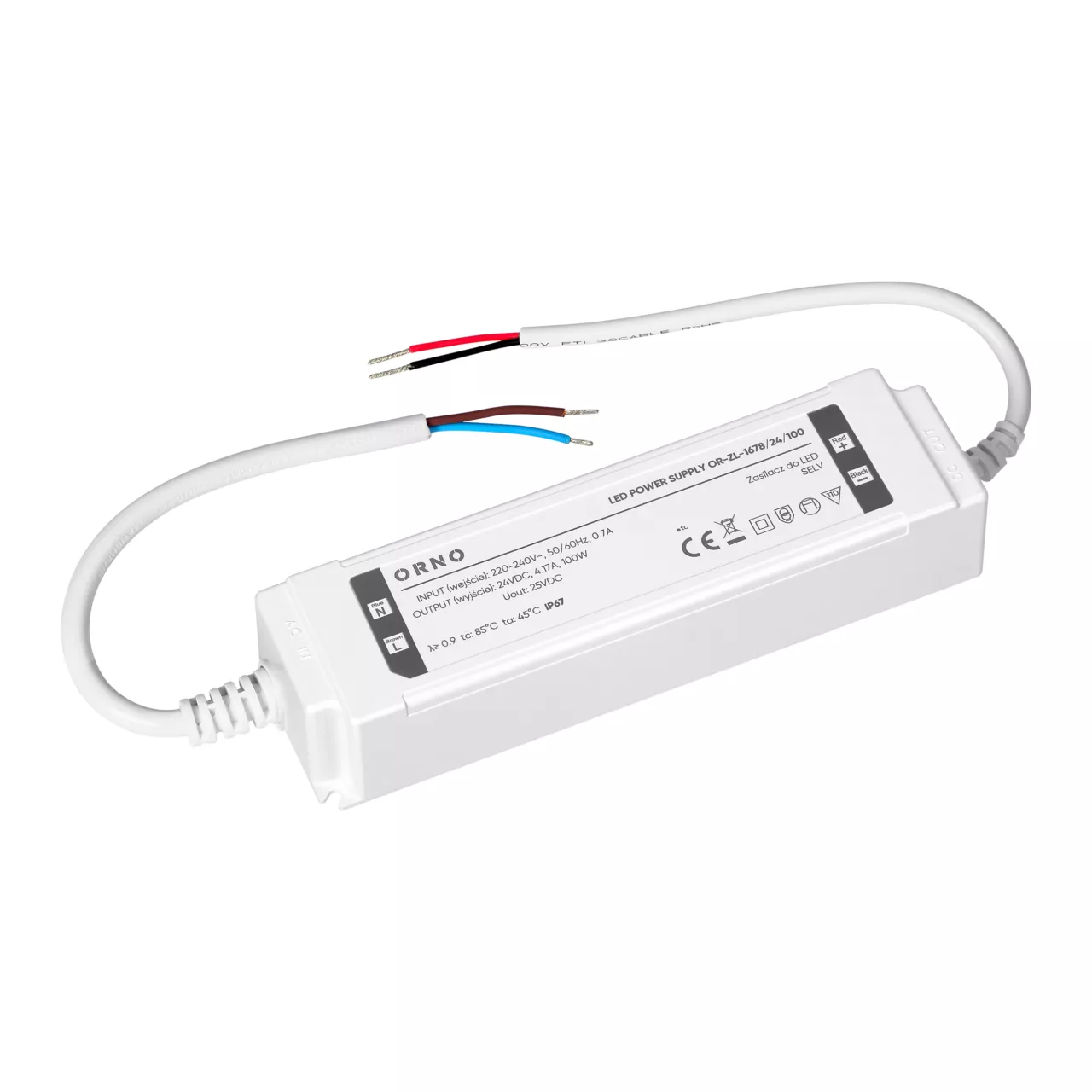 Urządzenie działa w zakresie napięcia wejściowego 220-240V i zapewnia maks. moc wyjściową 100W. Jego hermetyczna, wodoodporna obudowa wykonana z tworzywa sztucznego spełnia wymagania klasy ochrony IP67. Wysoka szczelność obudowy skutecznie chroni zasilacz przed wodą, pyłem i innymi czynnikami zewnętrznymi, co zapewnia długotrwałą i niezawodną pracę nawet w wymagającym otoczeniu, przede wszystkim dla oświetlenia zewnętrznego.