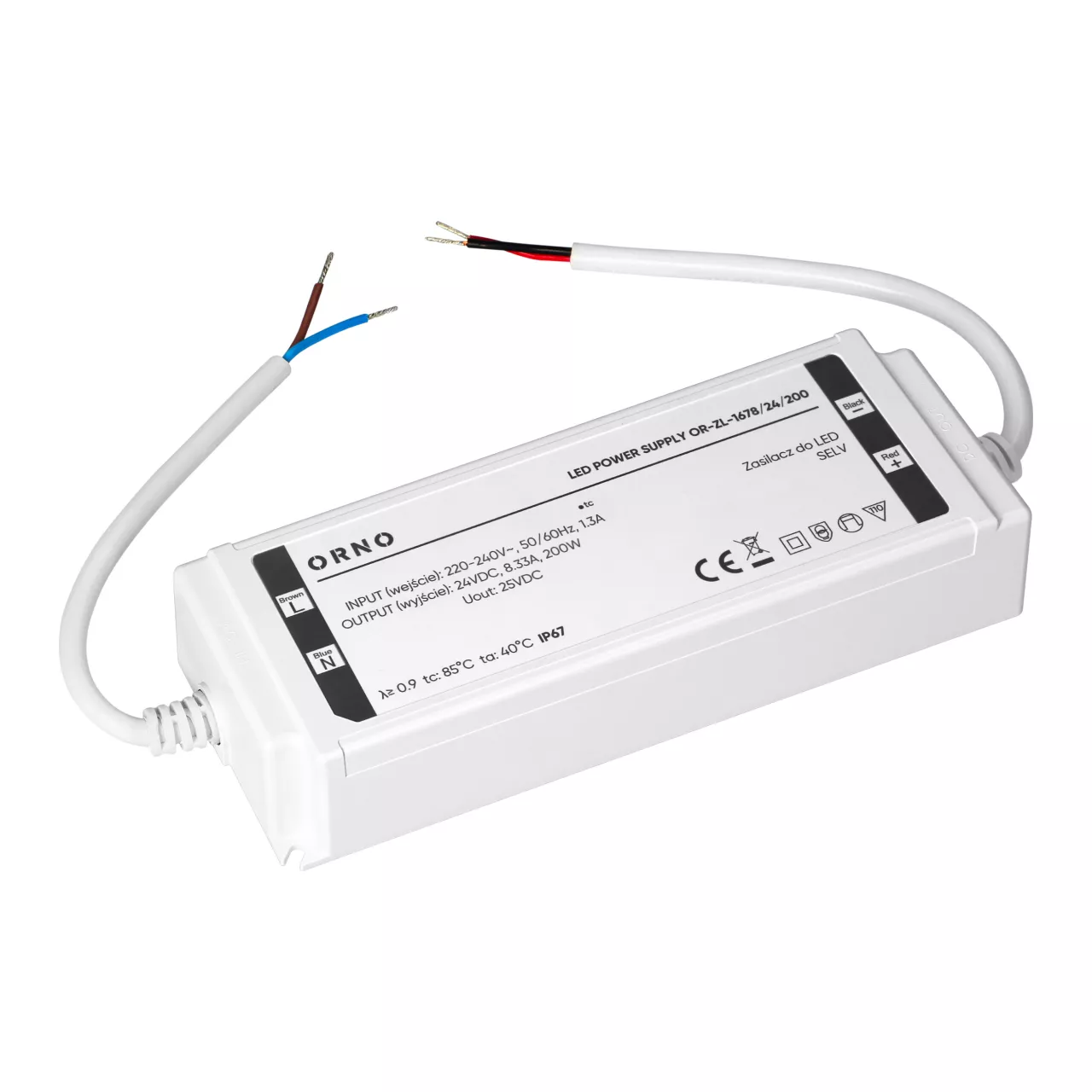 Urządzenie działa w zakresie napięcia wejściowego 220-240V i zapewnia maks. moc wyjściową 200W. Jego hermetyczna, wodoodporna obudowa wykonana z tworzywa sztucznego spełnia wymagania klasy ochrony IP67. Wysoka szczelność obudowy skutecznie chroni zasilacz przed wodą, pyłem i innymi czynnikami zewnętrznymi, co zapewnia długotrwałą i niezawodną pracę nawet w wymagającym otoczeniu, przede wszystkim dla oświetlenia zewnętrznego.