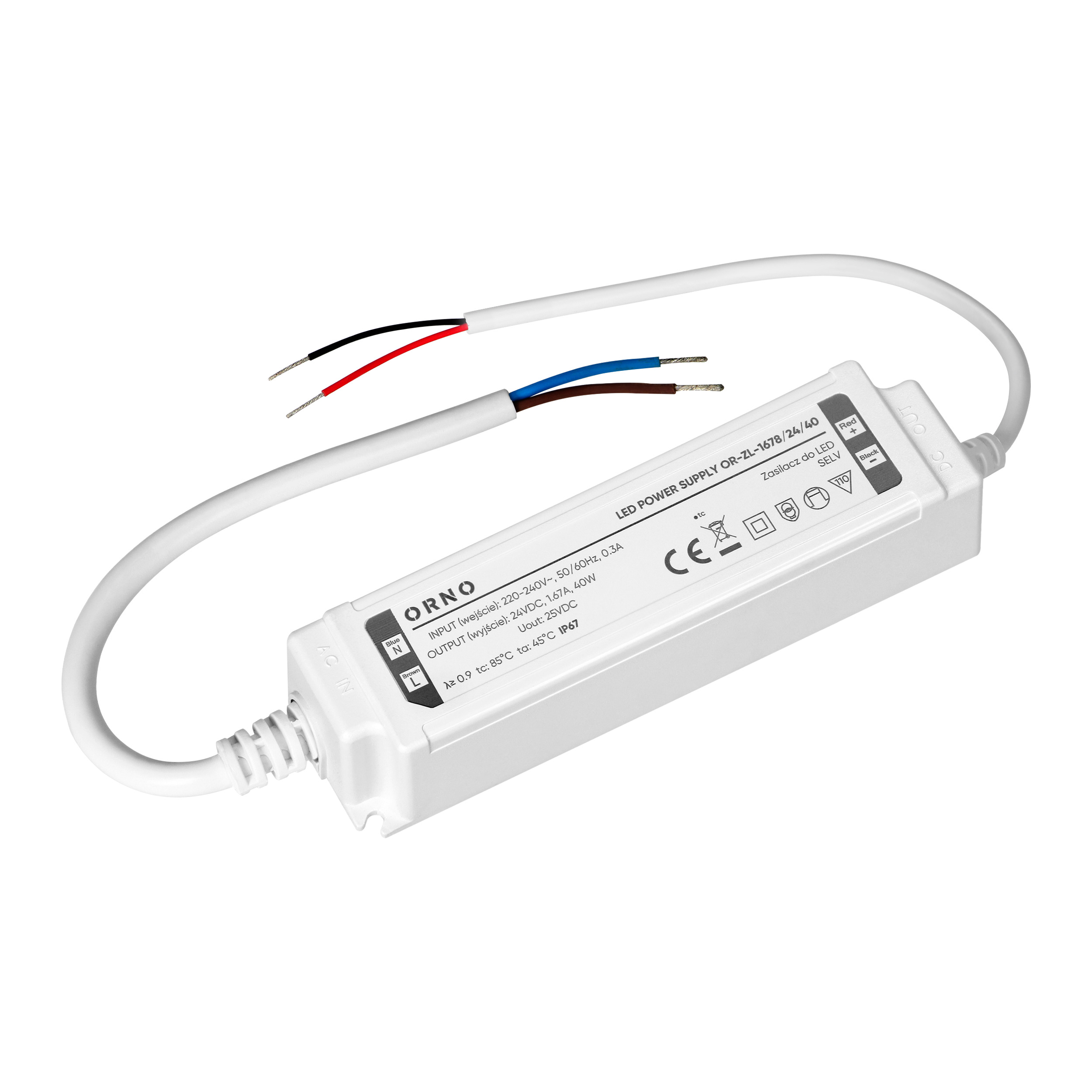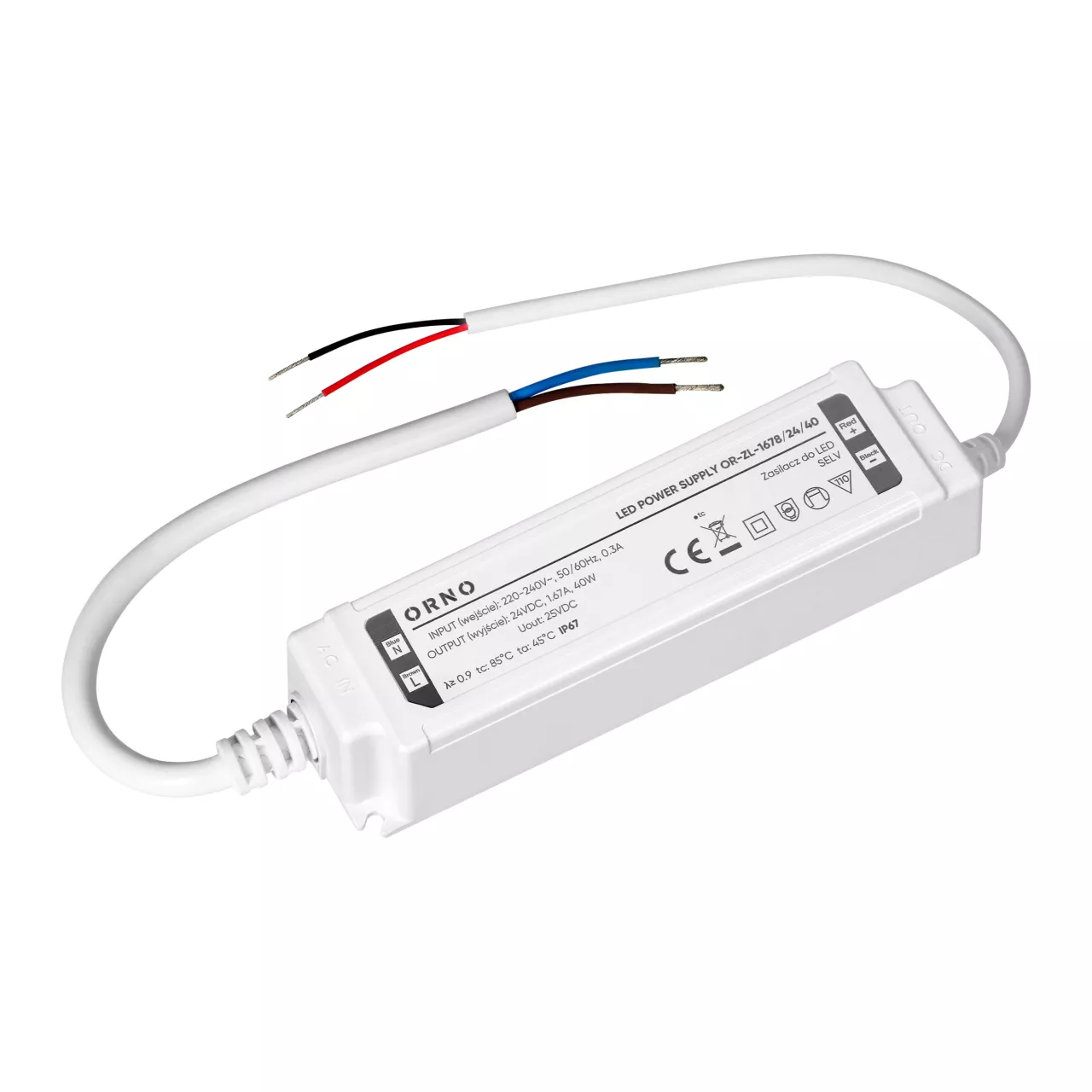 Urządzenie działa w zakresie napięcia wejściowego 220-240V i zapewnia maks. moc wyjściową 40W. Jego hermetyczna, wodoodporna obudowa wykonana z tworzywa sztucznego spełnia wymagania klasy ochrony IP67. Wysoka szczelność obudowy skutecznie chroni zasilacz przed wodą, pyłem i innymi czynnikami zewnętrznymi, co zapewnia długotrwałą i niezawodną pracę nawet w wymagającym otoczeniu, przede wszystkim dla oświetlenia zewnętrznego.