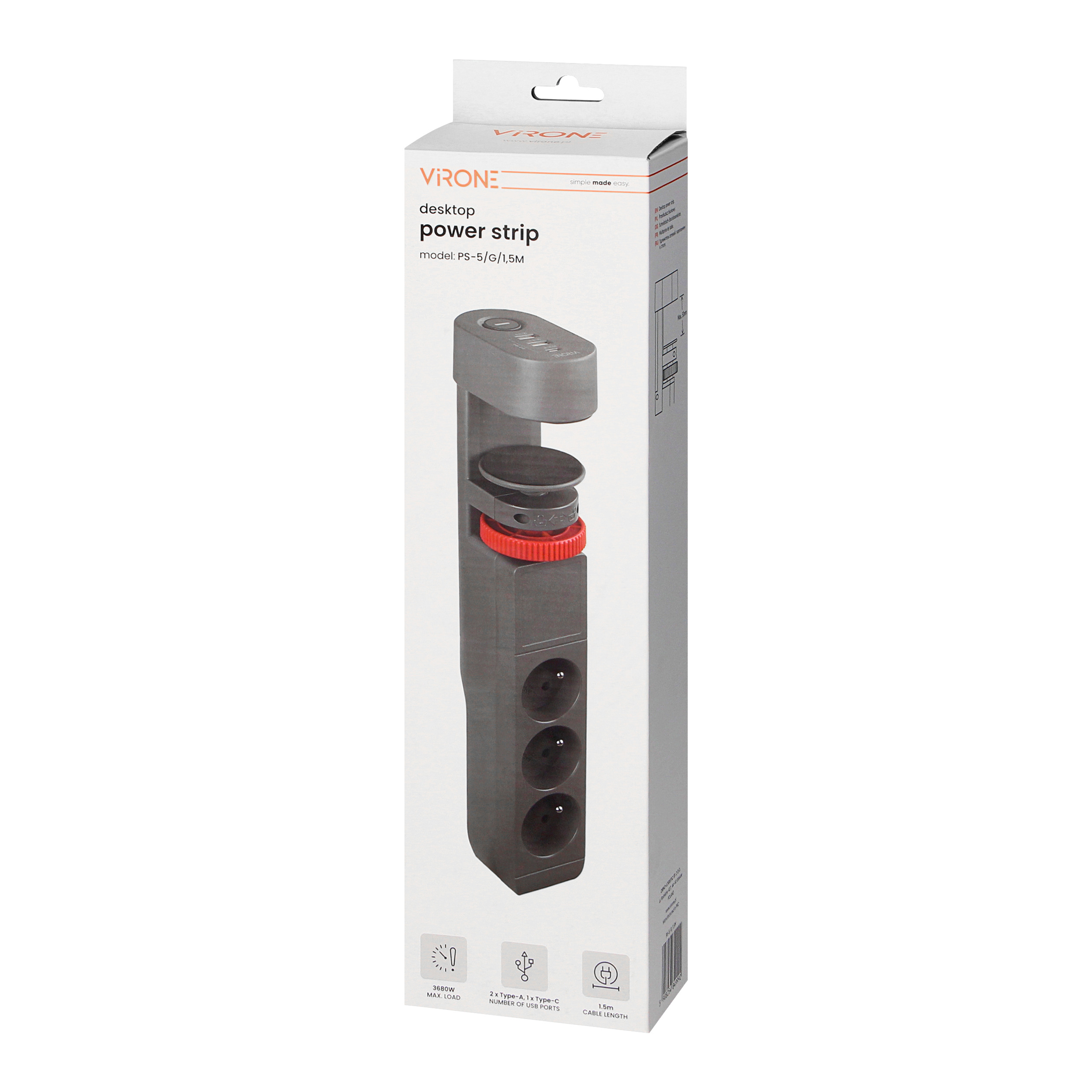 Prąd znamionowy wynoszący 16A pozwala na zasilanie urządzeń o dużym poborze mocy, o max. obciążeniu 3680W. 3 gniazda sieciowe w standardzie francuskim 2P+Z pozwalają na podłączenie standardowych urządzeń, takich jak komputer czy sprzęt domowy, a wbudowana ładowarka USB (2xUSB-A i 1xUSB-C) umożliwia ładowanie aż 3 urządzeń mobilnych jednocześnie, takich jak: smartfon, tablet czy powerbank. Prąd znamionowy ładowarki USB na poziomie 3,4A pozwala na szybkie ładowanie urządzeń mobilnych.