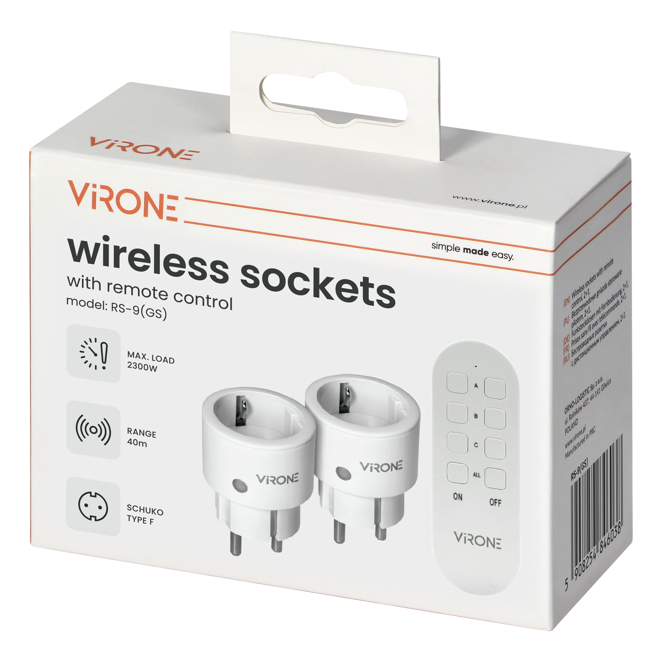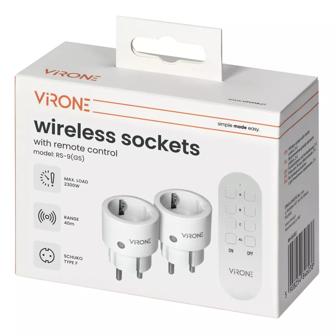 Zestaw zawiera pilot o kompaktowych wymiarach (110x37x10 mm), który zapewnia wygodę obsługi, umożliwiając jednokierunkowe sterowanie, a dwa pojedyncze gniazda sieciowe typu Schuko (2P+Z) są kompatybilne z wieloma urządzeniami. Stopień ochrony IP20 pozwala umieścić gniazda wewnątrz budynku, w miejscu suchym, nienarażonym na wilgoć. Maksymalne obciążenie wynosi 2300W. Wymiary gniazd wynoszą 49x74x49mm każde.
