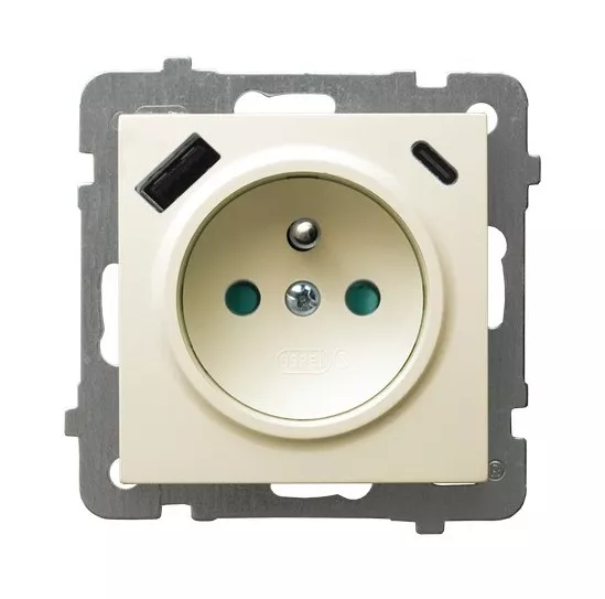 AS Gniazdo pojedyncze z uziemieniem z przesłonami torów prądowych, z ładowarką USB A+C - kolor ecru