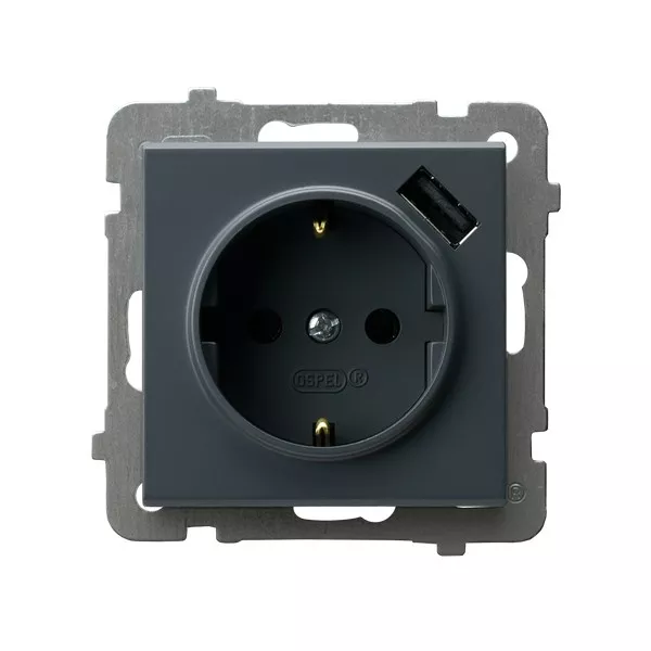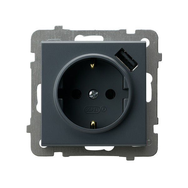 SONATA Gniazdo pojedyncze z uziemieniem schuko z przesłonami torów prądowych, z ładowarką USB - kolor szary grafit