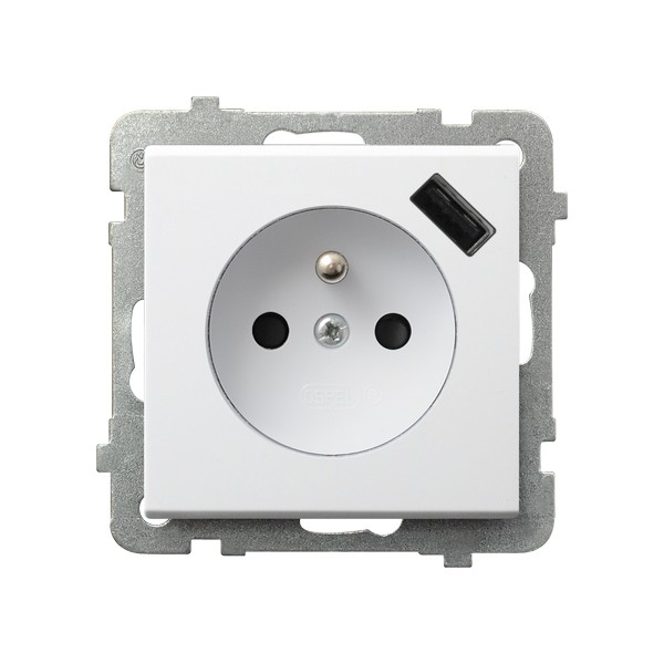 SONATA Gniazdo pojedyncze z uziemieniem z przesłonami torów prądowych, z ładowarką USB - kolor biały