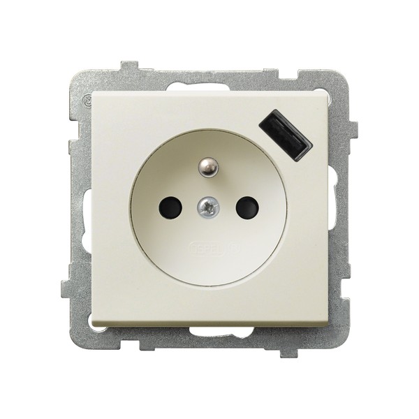 SONATA Gniazdo pojedyncze z uziemieniem z przesłonami torów prądowych, z ładowarką USB - kolor ecru