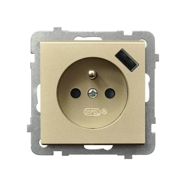 SONATA Gniazdo pojedyncze z uziemieniem z przesłonami torów prądowych, z ładowarką USB - kolor szampański złoty