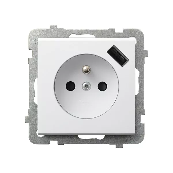 SONATA Gniazdo pojedyncze z uziemieniem z przesłonami torów prądowych, z ładowarką USB - kolor biały mat