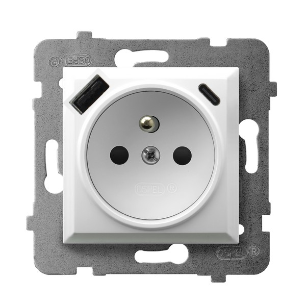 ARIA Gniazdo pojedyncze z uziemieniem z przesłonami torów prądowych, z ładowarką USB A+C - kolor biały