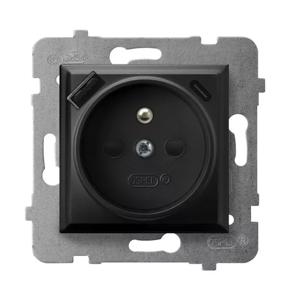 ARIA Gniazdo pojedyncze z uziemieniem z przesłonami torów prądowych, z ładowarką USB A+C - kolor czarny matowy