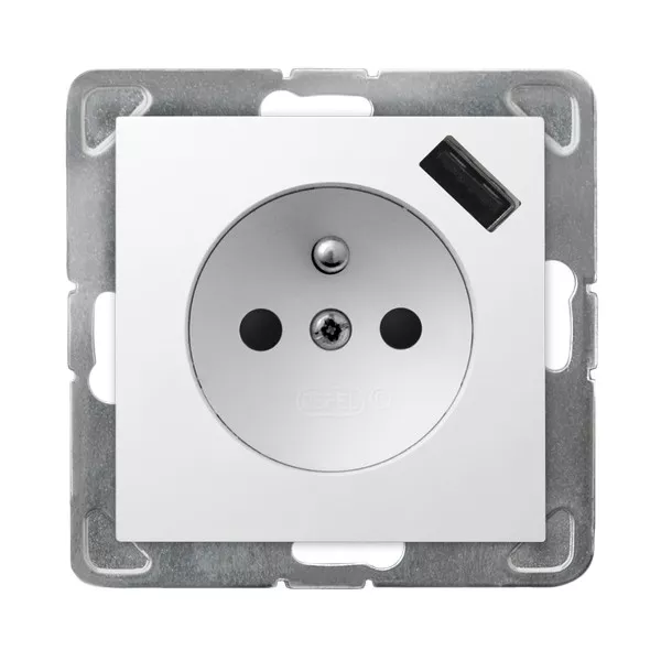 IMPRESJA Gniazdo pojedyncze z uziemieniem z przesłonami torów prądowych, z ładowarką USB - kolor biały