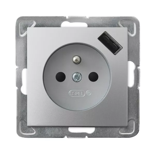 IMPRESJA Gniazdo pojedyncze z uziemieniem z przesłonami torów prądowych, z ładowarką USB - kolor srebro