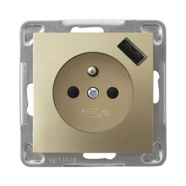 IMPRESJA Gniazdo pojedyncze z uziemieniem z przesłonami torów prądowych, z ładowarką USB - kolor złoty metalik
