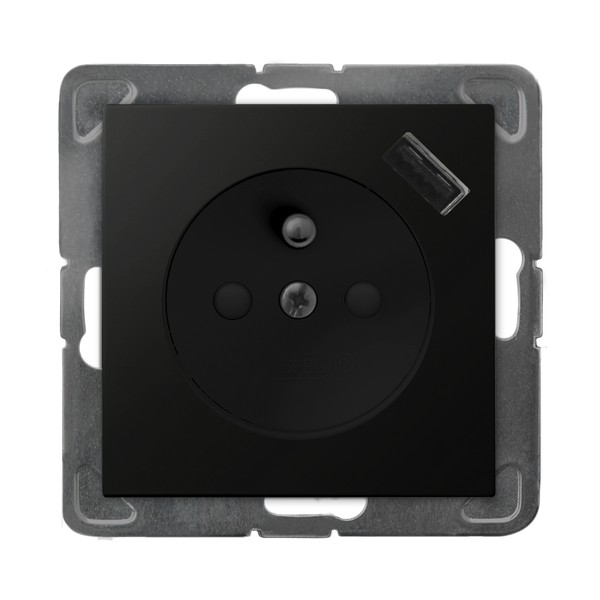 IMPRESJA Gniazdo pojedyncze z uziemieniem z przesłonami torów prądowych, z ładowarką USB - kolor czarny matowy
