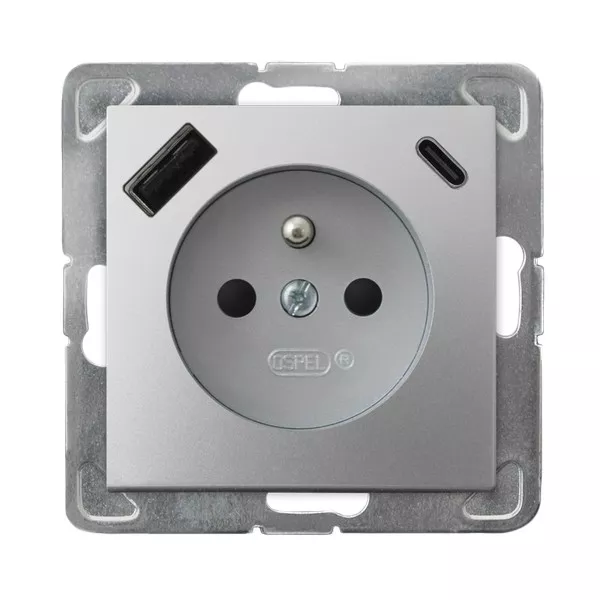 IMPRESJA Gniazdo pojedyncze z uziemieniem z przesłonami torów prądowych, z ładowarką USB A+C - kolor srebro