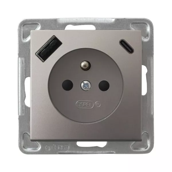 IMPRESJA Gniazdo pojedyncze z uziemieniem z przesłonami torów prądowych, z ładowarką USB A+C - kolor tytan