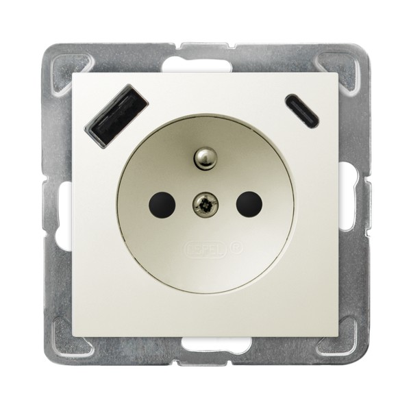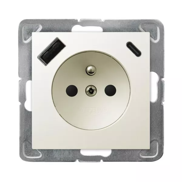 IMPRESJA Gniazdo pojedyncze z uziemieniem z przesłonami torów prądowych, z ładowarką USB A+C - kolor ecru