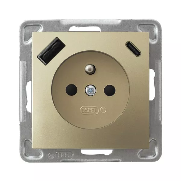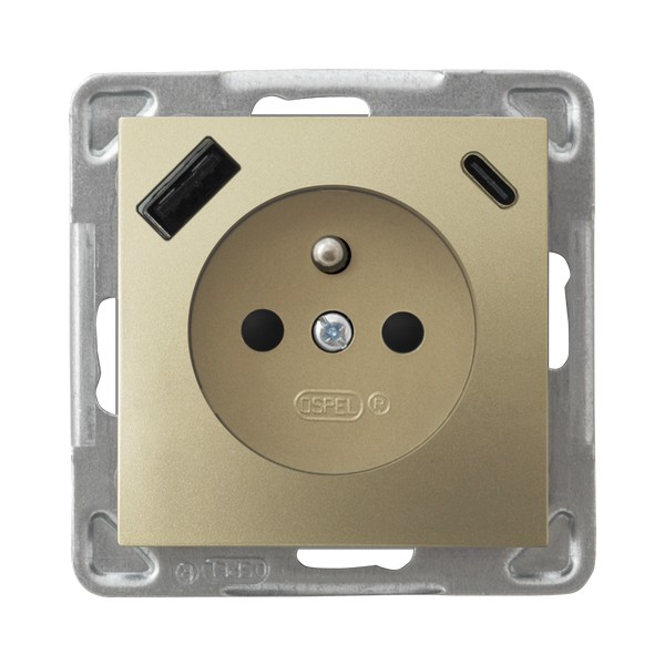 IMPRESJA Gniazdo pojedyncze z uziemieniem z przesłonami torów prądowych, z ładowarką USB A+C - kolor złoty metalik