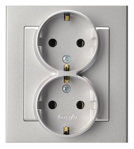 SONATA Gniazdo podwójne z uziemieniem schuko z przesłonami torów prądowych, kompletne z ramką - kolor srebro mat