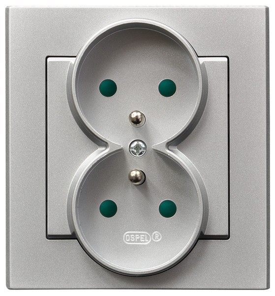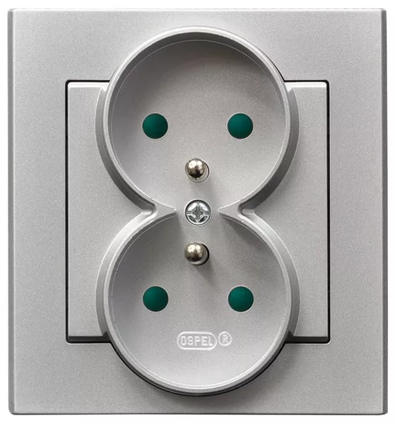 SONATA Gniazdo podwójne z uziemieniem z przesłonami torów prądowych, kompletne z ramką - kolor srebro mat