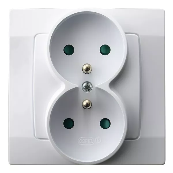 KARO Gniazdo podwójne z uziemieniem z przesłonami torów prądowych, kompletne z ramką - kolor biały