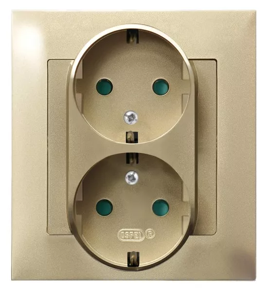 IMPRESJA Gniazdo podwójne z uziemieniem schuko z przesłonami torów prądowych, kompletne z ramką - kolor złoty metalik