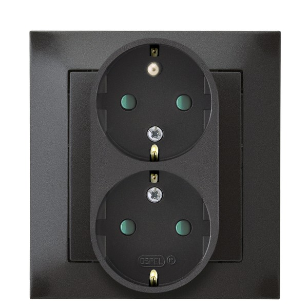 IMPRESJA Gniazdo podwójne z uziemieniem schuko z przesłonami torów prądowych, kompletne z ramką - kolor antracyt