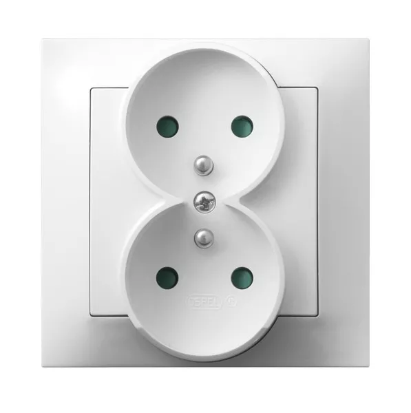IMPRESJA Gniazdo podwójne z uziemieniem z przesłonami torów prądowych, kompletne z ramką - kolor biały