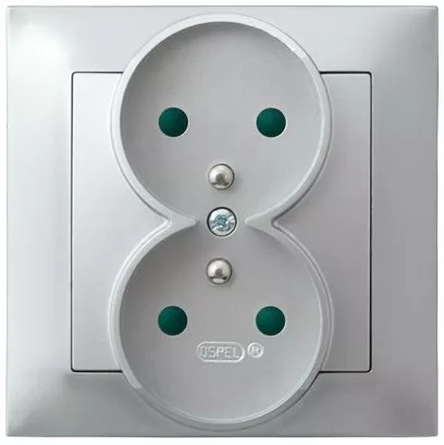 IMPRESJA Gniazdo podwójne z uziemieniem z przesłonami torów prądowych, kompletne z ramką - kolor srebro