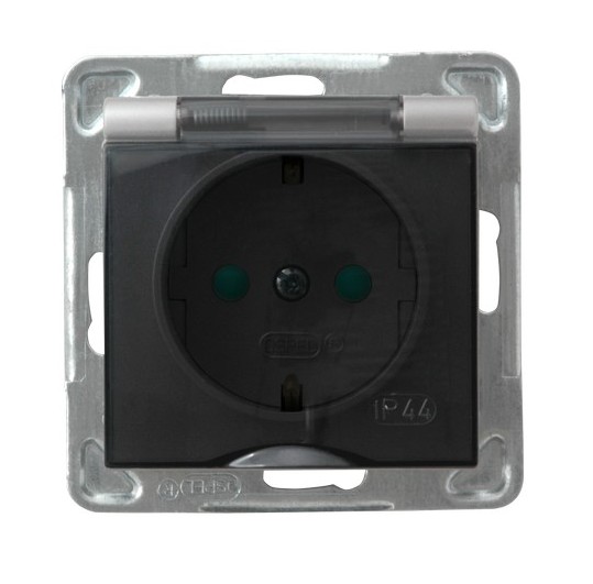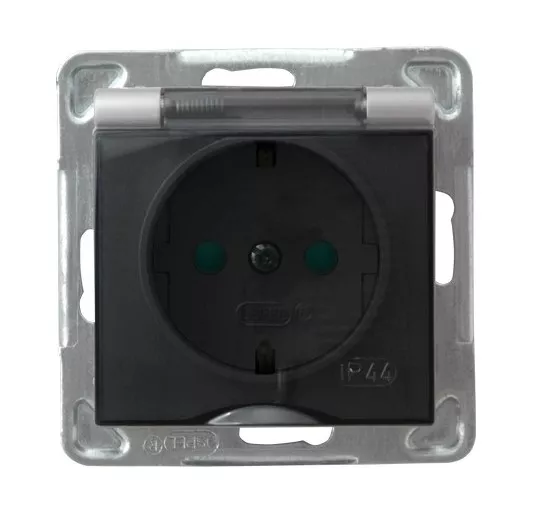 IMPRESJA Gniazdo bryzgoszczelne z uziemieniem schuko IP-44 z przesłonami torów prądowych wieczko przezroczyste - kolor srebro