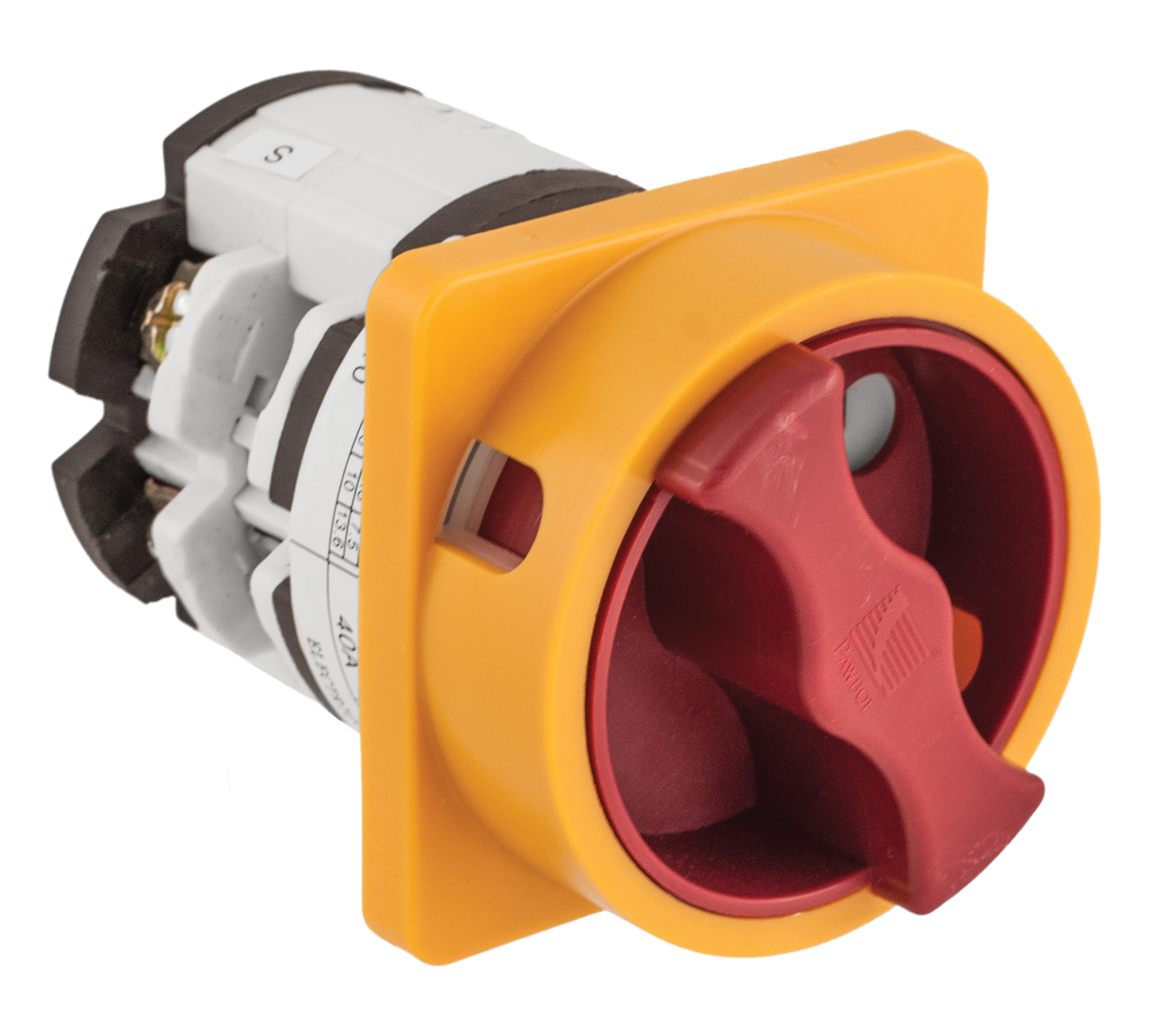 Łącznik krzywkowy tablicowy, 0/1, 25A, 690V, 3-fazowy, z możliwością blokady na kłódkę, żółto-czerwony, IP44
