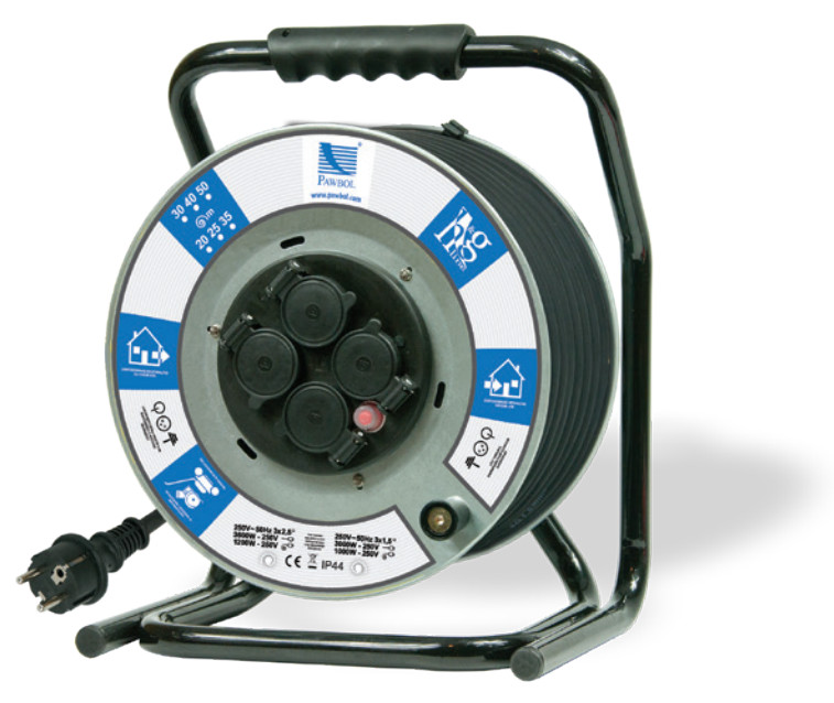 Przedłużacz na bębnie metalowym, fi300, przewód H05RR-F 3x2,5mm2 - 30m, 4x250V, 250V, 1x termik, szary, IP44