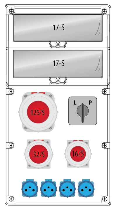 Rozdzielnica R-BOX 740 34S: 1x125A/5P, 1x32A/5P, 1x16A/5P, 4x250V, 1xL/P 125A, 400V, IP65