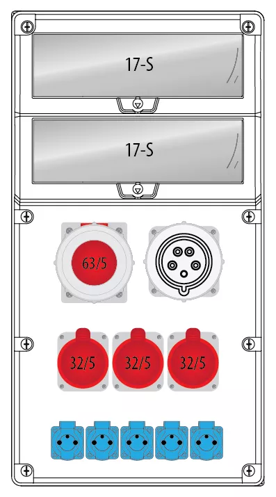 Rozdzielnica R-BOX 740 34S: 1x63A/5P, 1xWTP63A/5P, 3x32A/5P, 5x250V, 400V, IP44
