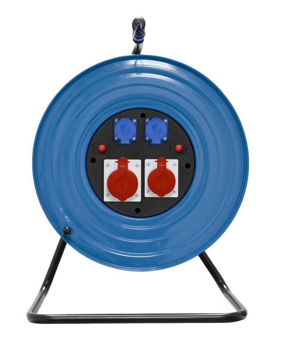 Rozgałęźnik na bębnie metalowym SOLID LINE, fi470, 1x32A/5P, 1x16A/5P, 2x250V, 400V, 2x termik, niebieski, IP44