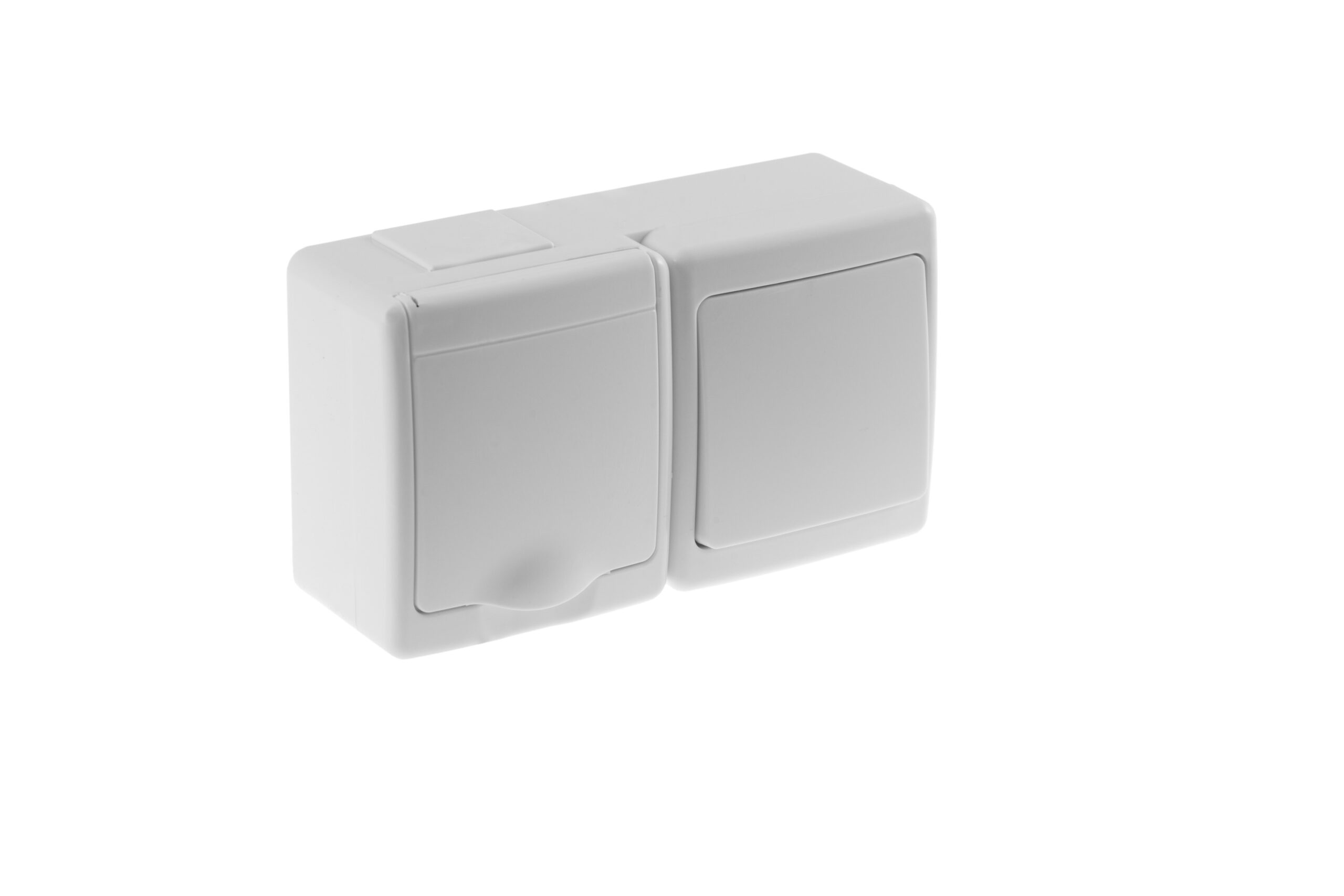 Wyłącznik BETA pojedynczy, jednobiegunowy i gniazdo BETA pojedyncze, białe, biała klapka, IP44