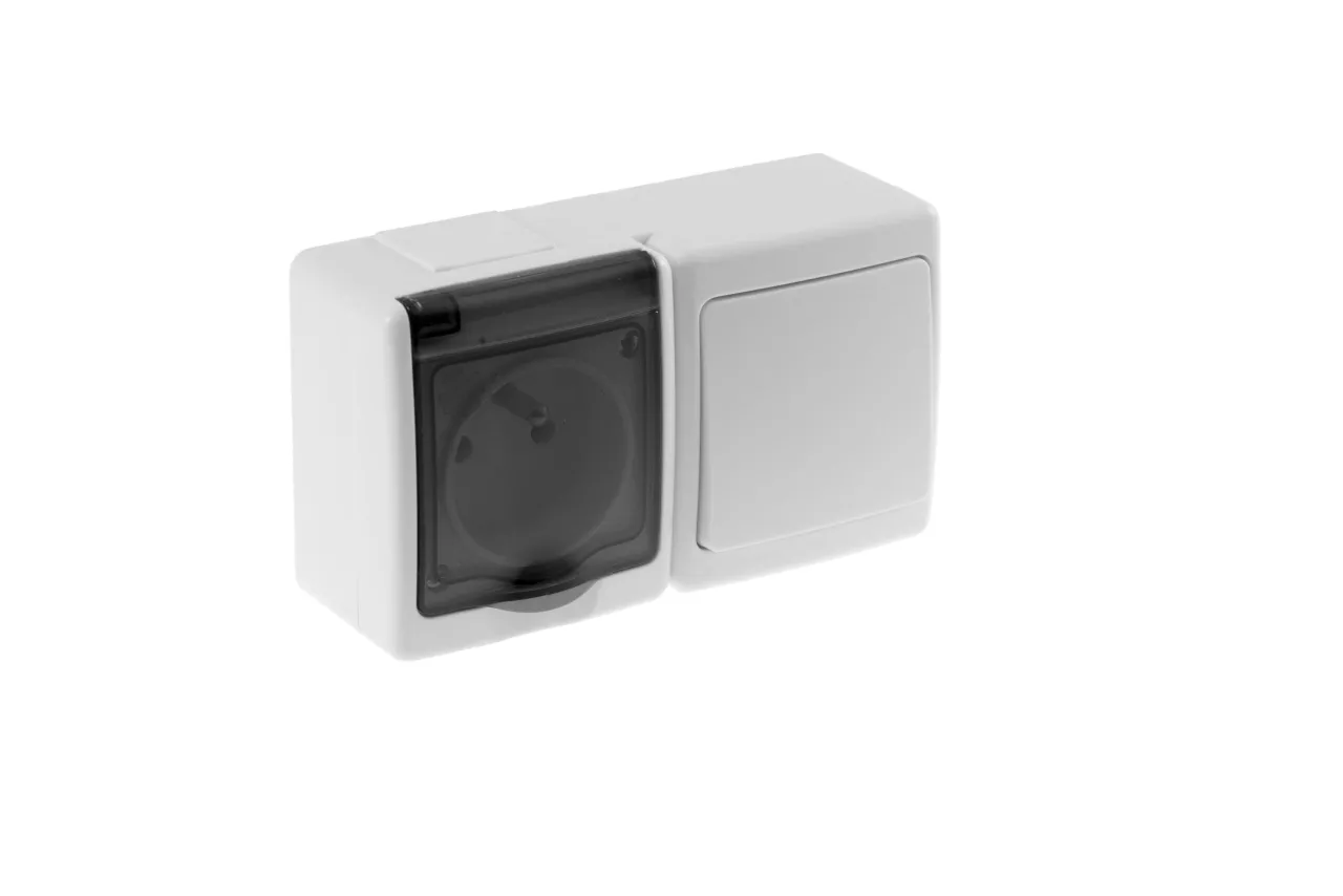 Wyłącznik BETA pojedynczy, jednobiegunowy i gniazdo BETA pojedyncze, białe, dymna klapka, IP44