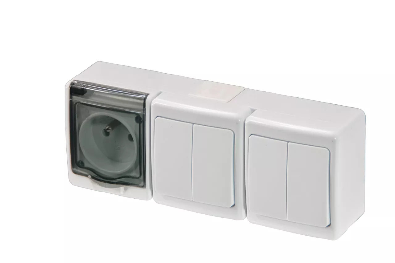 Wyłącznik BETA podwójny, świecznikowy i gniazdo BETA pojedyncze, białe, dymna klapka, IP44