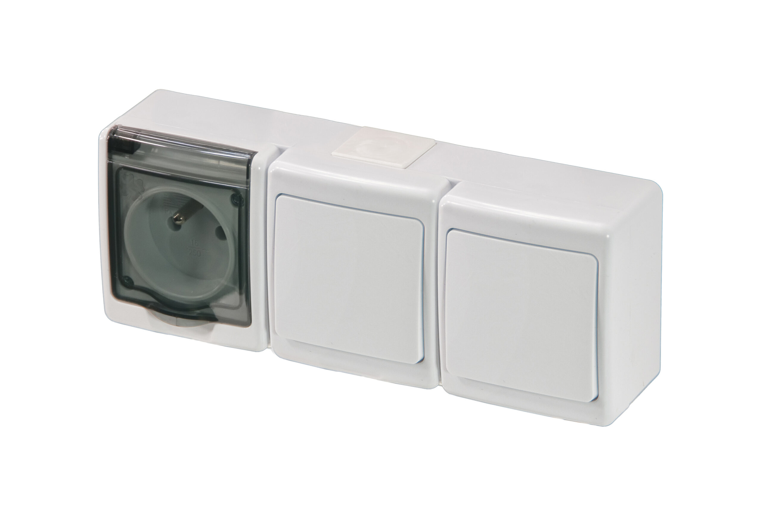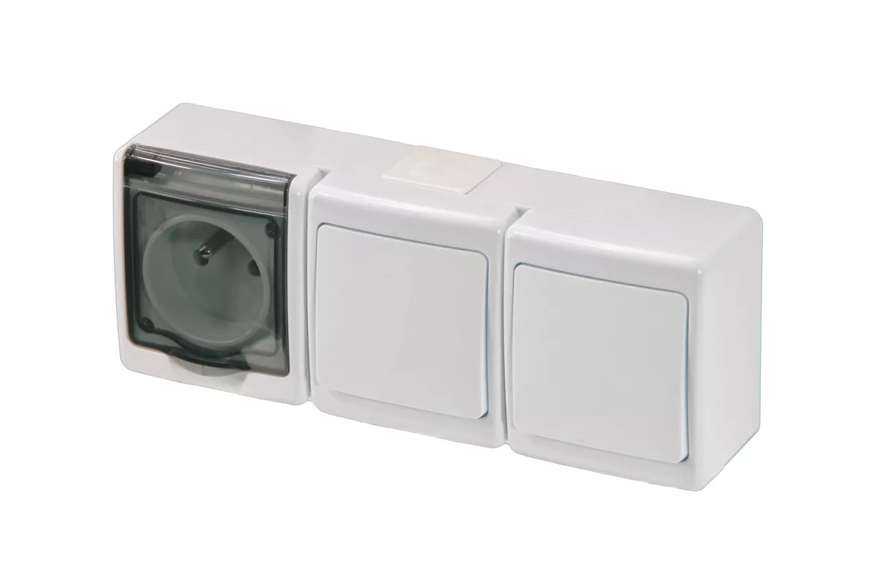 Wyłącznik BETA podwójny, jednobiegunowy i gniazdo BETA pojedyncze, białe, dymna klapka, IP44