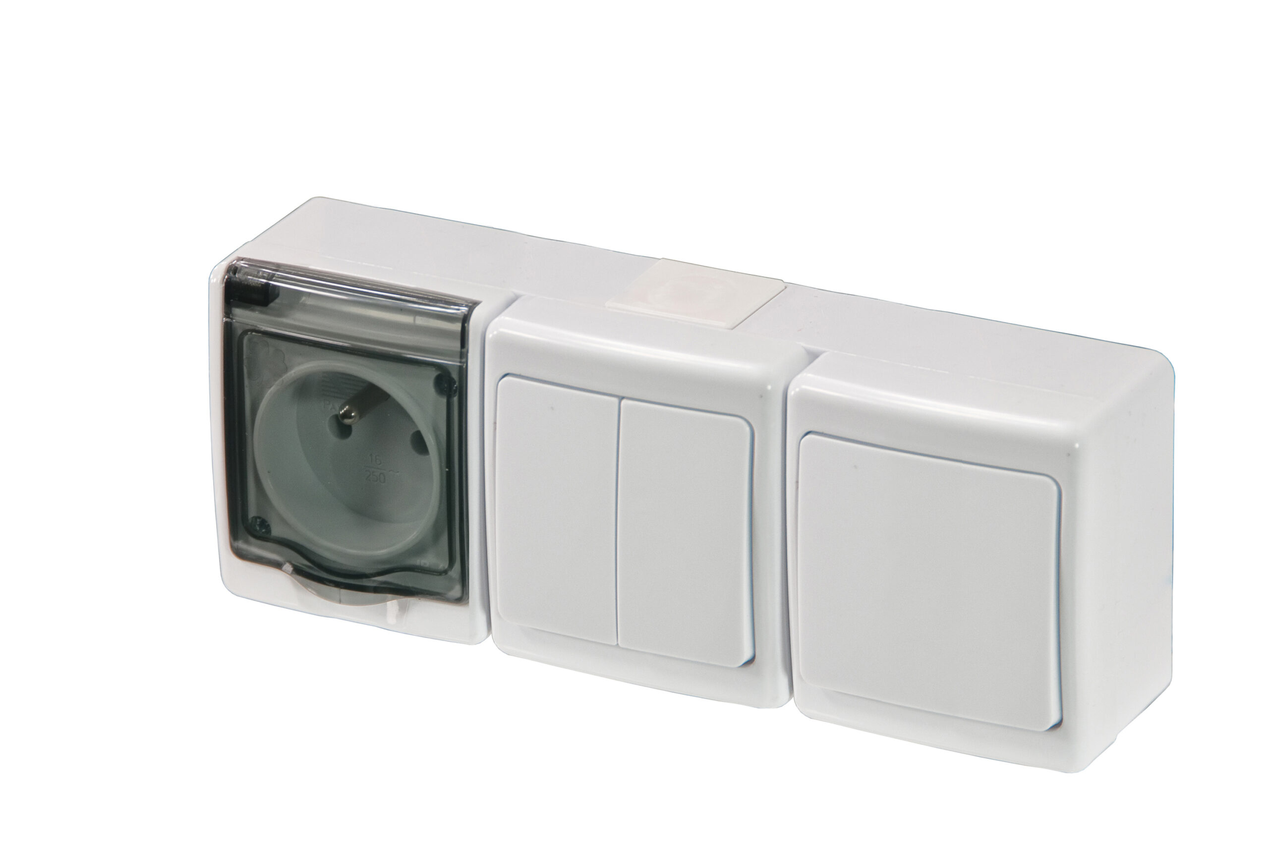 Wyłącznik BETA podwójny, jednobiegunowy i świecznikowy i gniazdo BETA pojedyncze, białe, dymna klapka, IP44