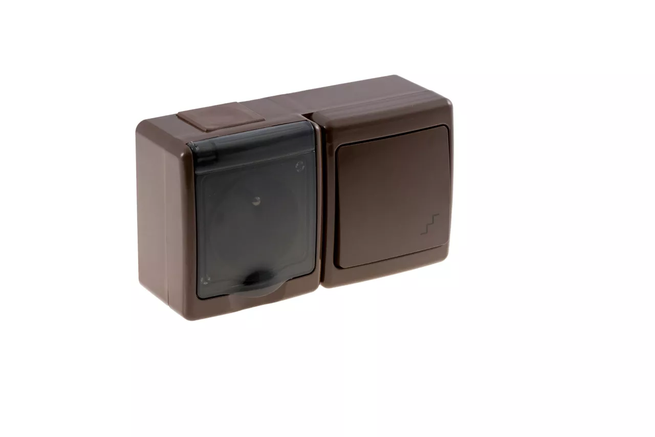 Wyłącznik BETA pojedynczy, schodowy i gniazdo BETA pojedyncze, brązowe, dymna klapka, IP44