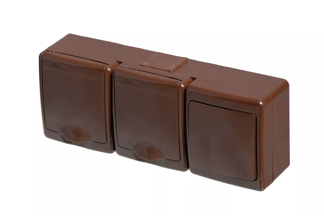 Wyłącznik BETA pojedynczy, jednobiegunowy i gniazdo BETA pojedyncze, brązowe, brązowa klapka, IP44